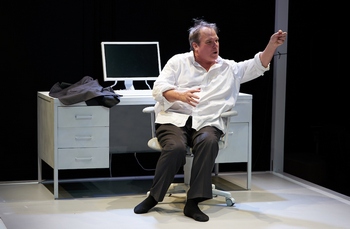 Maybe it's not that big a leapwe're all destroyers, one way or another. The "singularity," of course, is a sort of anticipated computer messiah, which will bury us all in one vast grave, once it realizes its own supremacy. Here, the unexpected twist seems to be that a human being has somehow gotten there first: becoming a hybrid of computer intelligence, at the cost of every other human in his sphere (and quite a few far beyond it). But, after an initial burst of homicide, he (or it) has been contained. In Mr. Ostermaier's 85-minute play, enjoying its first English translation and American premiere, Patrick Siler directs Alan Knoll in a one-man show that's sprawling and devilish and bizarre. But Mr. Knoll, one of the great uncommon threads on stage in local theater for the last forty-odd years, manages to be impish and horrifying and charming in ways that defy and uplift the story beyond all reason. The playwright won the Bertolt Brecht Literary Prize in 2010, among other honors; and Upstream producer Philip Boehm wrote the English translation, which is elegant and outrageously funny. I mean, it's not a laff-riot that the stockbroker murders his family and therapist, in a sort of personal "downsizing" (which any corporate raider might understand, at least on paper). That's after the family house pets are abolished, one by one. And it's not hilarious that he has to be confined in a sort of "black box" container, sealed-off from the rest of us, or that he is switched "on and off" with injected drugs. But, somehow, his being swallowed-up by the speculator's mindset, and the roar of computer data rushing through the markets into his brain, create an irresistible compulsion to the exclusion of all else. And his lapsing into manic explanations of everyone else's common investing mistakes, and the odd moments of smug delight at his own successes, are all pretty darned funny, in Mr. Knoll's kaleidoscopic performance. The program notes say that director Patrick Siler observed commodities traders up close in Chicago in the 1990s, when he worked at an investment research firm. Thanks, perhaps, to all that secret note-taking, the hair-on-fire broker we see here has a brain like an antique lawyer's desk: with a hundred little drawers in it, and a manic, sometimes smirking explanation for everything that goes wrong in his life; and a chuckling disdain for everything that goes wrong in ours. His power is global and his trading in this country can destroy another nation's currency, or provoke violence in the streets on the other side of the planet. There are a million facets in this fast-paced performance. But, as drawn here, the man is also nigh on to cherubic, like a naughty three-year-old, when he's not striving to be a Master of the Universe, even when it's all fallen apartmaybe simply because he pricked his finger with a paper clip, working at his computer. Maybe, somehow, that created a blood bond with the financial side of the internet. That was right before the firemen broke down the door, and he ended up in this box-like roomsurrounded by an audience observing him from behind their surgical face masks. The scientific process behind his transmogrification into a computer-enhanced god is never dwelt upon in words. But it's as good an operating system as any other, for his behavior, and for the show's themes of greed and cutthroat ambition, and for his dangerous struggle through to emerge from his own metamorphosis. Through February 25, 2018, at the Kranzberg Arts Center, 501 N. Grand Boulevard, St. Louis MO. For more information visit www.upstreamtheater.org. Onstage: Offstage: * Denotes Member, Actors' Equity Association |