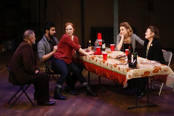 The Humans might also be viewed as a quirky update of Barefoot In The Park, set on a first Thanksgiving at a young couple's ratty Ground Zero apartmentif it weren't for the crack of doom that sounds occasionally, overhead. Still it's quite a charming show. The Humans debuted in Chicago in 2014, then played Off-Broadway in 2015 before a big theatrical promotion the following year, where it won a Tony for Best Play on Broadway. It has loads of humor, but with a dark undercurrent. For the Blake clan, it's the early 21st century, and there's no stopping the oligarchy that's ruthlessly gutting one life after another. That sounds like an awful lot for any play to have to live up to, but there's magic at work on the Repertory Theatre's mainstage. Even with one foot set in something as familiar as a Neil Simon comedy, there's plenty of room for the Blakes to explore the unknown, under the direction of soon-to-be-retired Artistic Director Steven Woolf. Mr. Woolf will climb down to become our theatrical elder statesman, though the future is anything but certain for his current onstage clan. Their rituals and family jokes have recently become a crutch for sudden economic dislocation. And it all leads to a surreal scene, when storylines converge, in an extraordinary dream-like sequence at the end. Talk of dreams recurs throughout, of both the old and new American varieties, and there's the familiar theatrical device of a dying, demented senior citizen (here the nearly spectral Darrie Lawrence as Momo Blake), who exists in her own perpetual dream-state. And maybe there's a meta-reality at work too, in the lineage of Irish drama. As in Brian Friel's Dancing at Lughnasa, human destruction for these Irish-Americans from Scranton has become as reliably regular as the G line. Brian Dykstra is commanding and kind, by turns, as the dad (and the nearly bereaved son of Momo). His future involves what should be a dream house on a lake somewhere in Pennsylvania, though he seems to hear Wes Craven's living dead stalking there already. And Kathleen Wise is the older daughter, who's recently been inducted in the burgeoning zombie classit's a great performance as a lesbian lawyer, stunned to have worked hard and been a good wife for years, only to be unceremoniously dumped in both fields, just as her body fails her in her prime. But it's also funny, I swear! Lauren Marcus and Fajer Kaisi are excellent as the young hostess and her swain. It's no longer terribly odd to find that she's also dangling by a thread, but he seems to have a weirdly, inexplicably bright future ahead of him, putting an odd tang in the air. Material success, even for these well-socialized American Catholics, is very nearly in bad taste these days. (Ms. Marcus' own reading of a half-hearted letter of recommendation is one of the many naturalistic highlights in her performance.) One moment the steady comedy acts as a force-field containing everyone's darkest doubts; and the next it's the other way around, like some inescapable, loving trap. "Well, what family doesn't have it's ups and downs," as Eleanor of Aquitaine is supposed to have said (it was said by Ms. Schultz, in fact, in a recent season at the Rep). And we're delighted to find, by the end here, we hardly know which is which. Through March 4, 2018 at the Repertory Theatre of St. Louis, 130 Edgar Rd., St. Louis MO. For more information visit www.repstl.org. The Players (in speaking order) Production Credits Additional Production Credits |