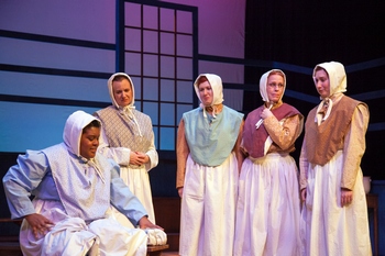 And this allows us to focus entirely on the earthly problem unfolding within Arlene Hutton's 85-minute play, which appeared Off-Broadway in 2001: a Shaker women's group (in rural Kentucky, in 1830) is pulled apart when two of its younger members report visions of angels and Heaven, out beyond their own sanctified grounds. Parenthetically, it turns out that both those visionaries have also been young victims of sexual abuse. In that regard, you might leap to the conclusion that As It Is in Heaven bears at least a passing resemblance to Arthur Miller's The Crucible. But you'd be way off the mark. Instead, the struggle here is a new version of the age-old conflict between the law and the spirit, with the one-of-a-kind Amy Loui as the leader of this Christian sorority, and Patrice Foster and Amanda Wales as the two young Catherines of Sienna. On stage, Ms. Loui never obviously aspires to "theatrical greatness," but it almost always manages to track her down, one way or another. Ms. Foster and Ms. Wales are soft-spoken, luminous rebels as Fanny and Polly, and the sexual abuse in their characters' lives is never tied to their revelation of miraculous apparitions. Even when a third, similar abuse case among the pro-apparition splinter group is revealed, we are left to ponder any linkage on our own time. The excitement over the visions of angels and light, and the music of the spheres, is just part of an air of distraction that affects the sisters, and Hannah (Ms. Loui) steps in again and again to get things back on track. Meanwhile, the atmosphere of the play is deeply, beautifully folksy: The women, in their self-abnegation, come to resemble little hand-made dolls with carved apple heads, their little wisps of hair peeking out from under plain scarves. They come and go in bright cheerful hymns, genuinely exulting in a kind of shared joy that scarcely seems to exist in this world. And all that awakens a kind of spiritual innocence in us too. The tiny scale of the story, and the manner in which our own vision is narrowed down to the simple and human and humble, is delightful. The audience is stripped, like novitiates, of worldly things, and trained instead to look only to the soul, by the witnessing of an exercise in purification on stage. At the outset, Ms. Loui leads the sisters in their public confessions of very small matters indeed: forgetting to pray for others, letting the muffins burn, and on and on. And she, and other fine actresses like Laurie McConnell and Mary Schnitzler and Leslie Wobbe, construct a monkish world where simplicity is the highest form of freedom. Although, among those elders, Alicia Revé Like still manages to set her own contrarian tone. But the big climactic group scene is silently, spiritually horrifying, as the girls' vision is suddenly corrupted. The real world intrudes in strange ways, like an obstacle course at a school for the blind: Jennelle Gilreath plays a troubled Shaker, a country wife haunted by a long string of infant mortalities, now harassed by an old bull at the colony's farm, charging at her like a case of symbolic sex abuse. And Christina Sittser glows on stage as one of the teenagers, ecstatically wishing to share the other girls' vision, but with her own startling confession to make, when the secular world threatens to ensnare her all over again. Through March 31, 2018, at the black box theater at the south end of Fontbonne University (enter off of Big Bend Blvd.), St. Louis MO. For more information visit www.mustardseedtheatre.com. Cast: Creatives: |