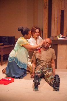 But one great performance shines throughand not just because a particular actor avoids being swallowed up in Hansol Jung's white-knuckle shocker. Darrious Varner rides the tidal wave of drama here in two very different roles. He is transformed, with naturalism and believability, as a Ugandan child soldier and later as a young gay man who's survived the millennial "kill the gays" movement in the central African nation (immediately west of Kenya), which was partly fueled by the financial and spiritual support of American evangelical missionaries. It's a plum set of dual roles and Mr. Varner far exceeds expectations. It would be a dazzling opportunity for any actor, to play both 13 year-old Pika and later the more age-appropriate Francis (Mr. Varner is 25). And here, smudges of dark make-up entirely change the shape of the actor's head. But something fatal seems to cleave through his heart in act one, as the child soldier, and then, as the willowy Francis (in act two), his spine slowly turns to iron as things get rough all over again. Playwright Jung seems to have put both characters in the "sweet spot" of each act, and we never lose sight of either one, as explosive events cast a shadow over everything else. The American missionaries are off-stage, as their lesbian daughter plots a very unofficial, very secret gay marriage on the altar of their Christian outpost. The always impressive Frankie Ferrari plays Chris, the missionaries' daughter, creating an earnest air of young love in her parents' little church in the northern Ugandan countryside. Jazmine Wade does well as two other characters, the Ugandan girl in love with Chris and, 14 years later (after intermission), as a preacher's wife. In act two, she exhibits a simple, confident manner and an elegant accent. Reginald Pierre is immediate and intimate in two very different roles: a young soldier in act one, seeking compromise with Pika; and later as a young preacher, earnestly struggling to confront his country's violent past, and his surprising role in it. The tension rises very briskly in act one, as a small 1990s -ra cassette recorder fills up with incriminating evidence of the secret gay wedding, and the girls' touching ceremony ends in chaos. Some of the lives are gradually reassembled in act two, until Uganda's old crisis is reborn. That's when 14 years of healing and secrets face sudden collapse. Cardboard Piano, through April 15, 2018, at West End Players Guild, Union Avenue Christian Church, 733 Union Blvd. (a block north of Delmar), St. Louis MO. For more information visit www.westendplayers.org. Cast: Crew |