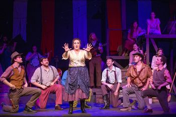 The great Southern writer Eudora Welty penned the original novella, and Alfred Uhry (Driving Miss Daisy and The Last Night Of Ballyhoo) wrote the highly atmospheric book and lyrics, with seamlessly evocative music by Robert Waldman. The Mississippi-based show (set in 1795) was nominated for "Best Libretto" after it opened on Broadway in 1975. And while the story wears thin, the performances, and the music, never do. Somehow it's all light and genuinely funny, and has an entire inner logic and reason that's shared equally among all the characters. That coherence is palpable at every moment of the show, thanks to director Been and choreographer Mike Hodges, who keeps things energetic, even when the music threatens to lull us to sleep near 10 p.m. with its soft melodies. The entire ensemble works very adeptly to counter that soporific effect with lively energy and exactly the right sense of humor for the material at hand. Phil Leveling, so powerful as Judas in Jesus Christ Superstar at the same venue back in April, is the smooth anti-hero of the title here. Though he's always elegant, as Eudora Welty's gentleman thief, physically he resembles John Cleese. And Dawn Schmid is excellent as the sweet, funny daughter of a wealthy tobacco farmer, who's played by stage-stalwart Jeffrey M. Wright. But the wicked stepmother is the show's star turn, riotously brought to life by Sarah Gene Dowling, a towering figure in a ruthless, giddy performance. I am informed by a friend that the whole show depends on this one role, Salome. So, thank goodness for the whackadoodle genius of Ms. Dowling. Logan Willmore and Kevin O'Brien are a great team as the dumber, competing thieves, Little Harp and Big Harp (the latter existing as a severed head in a box). And Bryce Miller ("A Simpleton") is a delightfully dimwitted boy named Goat, whose sister Airie is played by young Christen Ringhausen. Susie Lawrence is part of the oddly hilarious, rustic chorus, but also doubles as a talking raven, in a clever reversible costume by Artistic Director Gary F. Bell. It's still a mystery to me why every comedy doesn't have such all-encompassing inner life, a kind of rampant, invisibly reinforced exuberance. (Many Stray Dog musicals actually have had this, and I've grown to take it for granted.) This very successful Robber Bridegroom would be a perfect companion to Disney's Aladdin or The Little Mermaid. Though, in this case, cartoon animation would probably be redundant. How all these daffy people came to exist in Rodney, Mississippi, is explained away in the prologue, as a byproduct of the Mississippi River shifting its course away from the town. And, apparently, anyone who had any brains at all simply got up and moved away, too, once the river port dried up. Likewise, the story dries up early as well, and the first act may be ten minutes too long. On the other hand, however, Stray Dog has found a way to run the air conditioning quietly during a show, so the climate indoors is very amenable, at last, in the midst of summer. And though it's an ephemeral show (not withstanding the maleficent Ms. Dowling), nearly every song adds a new layer, and every big chorus number is beautifully stagedat least as exciting as any opera or ballet you'll see this year, in building a wonderfully improbable world of its own. The Robber Bridegroom, through August 18, 2018, at the Tower Grove Abbey, 2336 Tennessee Ave., St. Louis MO. For more information visit www.straydogtheatre.org. Cast: Artistic Staff: The Band: |