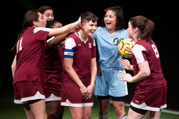 Early on, under the rich direction of Melissa Rain Anderson, it's all a bit maddening, like being trapped in a minivan with a gaggle of 16-year-old girls. And as is normal for that cohort, each one can maintain up to four separate conversations all at the same time, which (do the math) is something like eight to the fourth power conversations. (Seriously, do the math, because I can't.) Each of the girls seems monochromatic at first. Keaton Whittaker plays the "bad girl" who's been on the soccer field since the age of three or four, and for whom toughness is a guiding principle, both in the game and with older boys in hot tubs. If this were Luce's The Women and we were all desperate to see elegant Manhattan gals in fancy dress, she might have been the amoral Crystal. But here she must discover a more honest, elusive third form of toughness as the season plays out. Maya J. Christian is the very insistent wisecracker who learns to pose a mean moral conundrum; and Mary Katharine Harris is mysterious as the oddball homeschooled kid, seemingly from the tenth dimension. None of the characters is readily namable, each one is listed in the program by her jersey number, as befits a story of group cohesion. But #2 (Cecily Dowd) is first tagged as a tongue-talking evangelical, only to be re-classified by the girls, later, into a more anodyne sect. She still manages to be the moral authority, despite a half dozen on-field concussions. The detective work of categorizing each other's mercurial adolescent identities and the weighing out of each other's character are major themes here. But Rachael Logue is the no-nonsense team captain who steps in at the most awkward moments to keep the girls focused on soccer. There is the ever-present danger of "going too far" in one's declaration of self or the world, as #8 (Colleen Dougherty) discovers when she compares her teammates to Hobbits. Later, she manages to hit the group's psychological "sweet spot" by leading a singing version of the Preamble to the Constitution in one of the show's great unifying moments. Each girl is either a knowing "insider" or a pained "outsider" at various points in the 90-minute play, which first seems like a newly opened box of 500 puzzle pieces. But all the relationship-testing and all the bearing of one another's burdens makes for an indelible moment at the end. Nancy Bell is the only grown-up on stage in The Wolves, and she doesn't come on until the final minutes. Her uneasy, light cajoling of the girls' "upspeak" and their over-use of words like "like" (in an awkward little speech after a sudden tragedy) snowballs into a mad tirade. The girls can only watch in stunned silence, seeing how overwhelming grown-up responsibility can be. But, as the soccer mom herself could tell them, being "like" an adult is not the same as being an adult; and being "like" a child doesn't make one a child. Once she's done, the teenagers' collective response is one of fiery power as the lights go dim. The Wolves, through February 3, 2019, at the Repertory Theatre of St. Louis Studio Theatre, on the campus of Webster University, 110 Edgar Rd. St. Louis MO. For more information visit www.repstl.org. The Players (in speaking order): Artistic Staff: Additional Production Credits: |