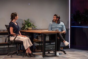 Amelia Acosta Powell directs with a great comic flair, mindful of the sleek, pleasant-but-remorseless tone of modern business. And Stephanie Machado stars as Tess, an adorable lab assistant who only talked to mice in her previous job. At lights-up, she has joined a high-tech firm known as The Gradient, where she will instead talk to swaggering men, to rid the world of "toxic masculinity." Her employer, one of the partners, is a brash, take-charge woman named Natalia, played by Christina Acosta Robinson with all the measured self-assuredness of any modern autocrat. The set by Carolyn Mraz (with hypnotic projections by Kaitlyn Pietras and Jason H. Thompson) is beautifully high-tech, with floating graphics instead of wallpaper, walls trimmed in light, and flat-screen TVs glowing with the corporate logo sizzling away on each. There's also the occasional motivational video presentation: Natalia, shown in triplicate. Her tone is brightly Orwellian, cheerily, non-judgmentally bullying heterosexual men to admit they've wronged the female population with their lack of empathy. And the clients of The Gradient seem to come in voluntarily. Or at least following some vague embarrassment in their lives with women. However ... there's this seething undertone of flim-flam, of the preemptive flippancy of con artists. And not just among the male subjects. That same faint sneer exists inside this psycho-analytic start-up as well. The whole business model is designed to "score" male clients on their interpersonal characteristics, then feed those scores into a mathematical algorithm, and, finally, counsel the men till the scores balance out, into a safer, more sensitive relationship prospect. Here, the interrogationsI mean counseling sessionsare usually gentle and upbeat. But they seem to carry the weight of societal condemnation, in an America of the very near future: boy meets girl, and girl immediately tries to put him on the defensive. Unlike Pride and Prejudice, there are no 19th century Boulangers, the dances where girls would gently try to evaluate their stiff and uncomfortable partners. But, just as with Mr. Darcy, it still takes several rhetorical circle dances just to get any of the men to come around. And even then the results can seem doubtful. Stephen Cefalu, Jr. steals the show with rapid-fire montages of eight different "bad dates" in three different stages of treatment. He gives us intense, pungent little caricatures, angry dudes, stoner dudes, seemingly violent Puerto Ricans, British know-it-alls, and so on: each seen together in a string of nearly frantic blackouts, in glimpses of therapy, over the course of days or weeks. Mr. Cefalu's quick-change characterizations are dazzling and audacious, as is playwright Del Rosso's grasp of nearly frightening, cutting-edge comedy. But sooner or later you get to someone who can game the system. And here, it's the all-too-charming Jackson, played by Yousof Sultani. He is relentless in his flirting and teasing of Tess, who gradually shows signs of surrender. The hair pomade budget, split between Mr. Sultani and Mr. Cefalu, must be through the roof. Anyway, eventually, he puts Tess on the defensive, threatening the whole system. Everyone on stage is perfect, especially those eight guys played in blistering succession by just one guy. And William DeMeritt is splendid as a co-worker who actually does manage to be natural, funny and sensitive, all at the same time. The downside to that emerges during an office Halloween party when his costume supplies ironic visual commentary, perhaps tempting Tess into her own unpleasant self-realization. Or maybe it's thanks to that glowing Kool-Aid dispenser in the break room that things begin to spiral out of control. It's a lot of fun, and impetuous too. Ms. Machado's final speech is a monologue distantly related to the mind-bending visual effects near the end of 2001: A Space Odyssey, a verbal equivalent of shooting across the universe, as the whole thing drives her mad (and she steals back the show from Mr. Cefalu). But after that, the denouement lands a bit awkwardly. Or maybe it's fine. Maybe it's ultimately a comment on the abrupt soullessness of modern business, where a 21st century girl-boss is sensitive and caring, right up till the nanosecond when she's not. Even in the capable hands of Christina Acosta Robinson as Natalia, that final blackout is mildly jarring as we in the audience wake up with a bump, to a world without all those deeply invasive algorithms. So far. The Gradient runs through October 24, 2021, at the Center of Contemporary Arts, 524 Trinity Ave. (just inside the University City gates, south of Delmar Blvd.), St. Louis MO For more information visit www.repstl.org. Cast: Production Staff: * Denotes Member, Actors Equity Association |