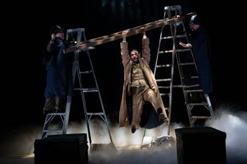Kate Bergstrom directs, sending her four-person cast through a flurry of very silly bits and goofy Alfred Hitchcock references in act one. But all of that Film History 101 stuff mostly gives way to a classic suspense yarn in the remainder of this two-hour and fifteen-minute show. There's still a boatload of silly props and frantic costume changes and a few nice special effects. But gradually, a magical balance with suspense, and even romance, emerges as well. John Buchan's original 1915 novel was set during World War I, and Alfred Hitchcock's film updated it to anticipate the second major war in Europe in 1935. This live theater parody is also set in 1935, written by Patrick Barlow for a 2005 stage debut and based on a concept by Simon Corble and Nobby Dimon. On opening night, the audience burst into applause after the chase scene on a train (three ladders, two trunks, and a few other props, in the dark, in a fog, on a "bridge"). Wrongly accused Richard Hannay (played here by Ryan Colbert) dangles from a siding over a crevasse, being the only man alive who can stop a plot to steal some kind of defense secrets out of England. That hairsbreadth escape, as the whole things spins around on a big turntable in act one, is a tribute to Ms. Bergstrom as a director and to Mr. Colbert as a tirelessly agile performer. Olivia Gilliatt plays various beautiful women along the way: first, a furtive German who needs a hideout; then a Scottish farm wife; and on to an exceedingly altruistic, almost unbearably outspoken English girl. As Pamela Edwards, she and Hannay go through a surprising number of relationship struggles while out on the lam–so many that we begin to worry more about them ever ending up as a couple, after all that work, rather than the mere fate of this sceptered isle. The jokes in the first half are pretty lame, but still we laugh. And those baggy-pants bits open our minds to all the frantic nonsense to come in novelist Buchan's action-packed story. Jimmy Kieffer and Futaba Shioda are wonderful as the quick-change artists who fill out the rest of the story: an evil genius and his professional hostess of a wife; various law enforcement officials; a pair of spies masquerading as law enforcement officials; a pair of doomed strafing pilots; a gaggle of duplicitous Scotsmen in their native wild; a pair of stage clowns; and the crucial figure of Dr. Memory–the man who memorizes fifty new facts a day (and his faithful sidekick) when we finally catch our breath, to wrap up at the London Palladium. If you could ever possibly stop this runaway train, the whole thing would probably bear no rational scrutiny at all. Which makes it the perfect entertainment for troubling times. The 39 Steps runs through April 10, 2022, at The Repertory Theatre of St. Louis, 130 Edgar Rd., St. Louis MO. Proof of vaccination, photo ID, and masks are required. For tickets and information visit www.repstl.org. Cast: Production Staff: * Denotes Member, Actors' Equity Association |