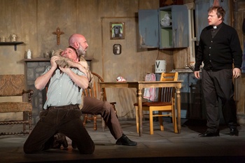 Robert Ashton directs The Lonesome West with an unerring eye for faith and absurdity in the tumble-down home of two brothers, Coleman and Valene (the raw and raucous Jason Meyers and Jeff Kargus). McDonagh wrote The Pillowman as well, another story of two young men: a great storyteller and his devoted special-needs brother. In The Lonesome West Coleman and Valene have one foot in each type, deft storytelling as well as classical, comical, theatrical idiocy. It puts them into a kind of perpetual "Punch and Judy" knockabout comedy, with horrifying twists and turns. Ted Drury is noble and long suffering as Father Welsh, a hapless, hopeless priest; and Hannah Geisz unveils layers of smiles and tears as Girleen Kelleher, a neighbor girl. Add on professional-grade pacing, even with plenty of nuance, and you've got yourself one hell of a show. Every year, governments spend billions of dollars hoping to lift men out of the squalor of ignorance and torment, oftentimes with very little hope of success. And after seeing this show I am just the tiniest bit glad they never quite manage it entirely, to raise us all up into some kind of worldwide, uniform nobility. In The Lonesome West you can hear the beauty in the music of existentialism and (between comic moments) a strange dark poetry of hopelessness in the brutal madness between two brothers. You might even think of The Lonesome West as a disguised story of the bullies of your own youth, in their own homes, behind closed doors, destroying one another. But it's still funny–and heartbreaking. Valene is earnest and simple, but easily provoked by his older brother Coleman. A long list of weird, violent, stupid tragedies blows through the narrative, like a lifelong train wreck, which begins (for us) after their father's funeral in act one. Rest assured, all this chaos and insanity will be retold in a straight-line refrain, like the end of a murder mystery, in a riveting scene at the very end. But only after that priest and that beautiful young woman of the town have thoroughly washed their hands of the pair. Mr. Drury and Ms. Geisz are perfectly cinematic on a park bench at the top of act two, as Father Welsh and Girleen. I felt like I was watching an Oscar-nominated film jammed into the middle of a bare-knuckles Marx Brothers comedy when Drury and Geisz discussed the priest's plan to leave town, after all the barbarism he's hammered away at for years there. True, it's a story of Irish faith and flesh, and the unrepentant Bible illiteracy of these frequently inebriated townspeople. But, miraculously, there's just enough philosophy embedded in the brothers' souls to pull them away from killing each other every two or three minutes. Which, of course, lands us back in the quadrant of Comedy, all over again. The Lonesome West runs through May 8, 2022, at West End Players Guild, Union Avenue Christian Church, 733 Union Avenue (just north of Delmar), St. Louis MO. Seating is arranged in very small groups, and face-masks are required throughout. A small but pivotal part of the story involves animal cruelty. For tickets and information call 314-667-5686 or visit www.westendplayers.org. Cast: Production Staff: |