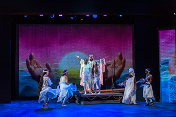 Christian Kitchens plays the title character with authenticity, charm and ease. But the modern American characters inside Dontrell Jones III's family are a little short on, well, character, in this slice-of-life-meets-mystical-rediscovery-of-one's-heritage story. The dialogue about who they are and what they want seems only about half the usual line count, which gives Dontrell the feeling of children's theater–except for the mild sexual and adult language content, which raises the age of the likely target audience to teenagers and their parents, I suppose. It becomes primarily a dancing show, with unforgettable, hallucinogenic spectacle on its side. Black Rep founder Ron Himes directs, shaping his actors' psychological surety and giving them a good, clipped sense of pace in their vignettes. The costumes by Daryl Harris are outstanding: emblematic, and even eye-popping, in scenes in which the actor/dancers swirl around the stage as elegant African mystics and shamans, or as dazzling tropical fish at an aquarium, with giant background projections around them to match. Heather Beal is the choreographer, and the movement of all of the cast members is fluid, reassured, and inspiring. Olajuwon Davis is great as an embittered American father (Dontrell Jr.) and as a magnificent ghostly progenitor in royal robes. And I'm a sucker for such polished, wild acting polarities, in dual-role performances. He is matched in strength by the ultra-professional Lakesha Glover, as Dontrell III's mother, who makes character statements even out of the show's balletic set changes. However, both parental characters could benefit from one or two more worried monologues, perhaps about why the dad is so territorial in defending his tiny little spot in life, even from his own family. Men are not always made small by what life does to them. But they often become small by failing to engage with what they've got. Here, as Dontrell Jr., Mr. Davis is reduced to almost a feral level, by a TV set and a comfy chair. But that comfy chair (we eventually realize) also squawks like distant seagulls, giving us another layer of sensory excellence, calling on his son to make a reverse crossing on the Atlantic Ocean. Claire McClannan is very good as the young woman Dontrell III goes out to sea with. As Erika, she's the wild card in the plot, impetuously carrying the burden of reuniting a young man with the spirit of his African roots. Dontrell, Who Kissed the Sea runs through July 23, 2022, at the Edison Theatre on the campus of Washington University, St. Louis MO. Parking is somewhat limited adjacent to the theater, but additional visitor parking is available underground, in front of Brookings Hall, and free after hours and on Sundays. For tickets and information, please visit www.theblackrep.org. Cast Production Staff * Denotes Member, Actors' Equity Association ** Denotes Member, the Society of Stage Directors and Choreographers |
