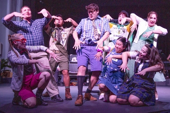 But it speaks more to childhood memories than to actual children. The play's high-concept, role-playing terror of childhood stressors, vividly re-lived by adult actors, would become nearly meaningless if told by actual children. (But it's really funny, I swear.) Couth and perdurable Stray Dog Theatre director Justin Been has got himself a very playful script and a perfect assortment of musical comedy actors who can pass for strangely tall ten-year-olds (or am I just getting shorter?). There are also three adult contest managers and four grown-up audience members to add tension to this delightful, intense, funny musical by William Finn (music and lyrics) and Rachel Sheinkin (book), and conceived by Rebecca Feldman. We are introduced to each child's awkward story through their pensive, private solos, which occasionally break out into glorious dreams for their futures. And then they are each put on the spot, again and again: asked to spell (usually) impossible-sounding words. There are also occasional curve-ball rules, and it all becomes a roller coaster ride in a rainstorm, where just holding on tight becomes impossible. "How do they make that work?," my spouse asked, before the show. "Well, typically you cast slightly stockier actors, who can mold themselves into the proportions of a child," I explained. But that doesn't apply to every actor or actress, and only captures a narrow plurality of all the different onstage transmogrifications here. Examples of other metamorphoses include: the panicked discipline of the over-achiever; the high-handedness of a child in correcting other children; and a wary courtesy and suspicious deference to grown-ups, who wield outrageously difficult words I've never even heard of, along with one or two unexpected rules. Jason Meyers (still the funniest actor in St. Louis) is wickedly unhelpful as the assistant principal who quizzes these martyred waifs, and Stephanie Merritt is full of un-ironic-sounding ironic narration, as an ambitious real estate agent who serves as the organizer of the contest. My favorite section is where time begins to slip, then go faster, then much slower, then much faster again, as the psychological trench warfare of the contest overwhelms us all. Kevin O'Brien is (yet again) a genius on stage, this time portraying the tormented William Morris Barfée. And Grace Langford is an absolute delight as Olive Ostrovsky, the girl who waits in vain for her father to show up to pay the entrance fee, and who unleashes her fantastic voice about 3/4 of the way through. In the supporting cast, I was most struck by Clayton Humburg, who is utterly changed as the grinning, delightfully offbeat Leaf Coneybear, a home-schooled boy who makes his own clothing. The level of trust and vulnerability and unselfconsciousness he shows is highly admirable, and strangely terrifying. The world can do terrible things to kids like that. Kevin Corpuz is great (as always) as the proud over-achiever Charlito "Chip" Tolentino, and in other roles. The highly adept singer and choreographer Sara Rae Womack is quizzical in watching the others compete, when she's not rolling her eyes at a softball word to spell. And another performer who would be a leading lady anyplace else, Dawn Schmid, plays Logainne Schwartzandgrubenierre, the prim elementary school president of her school's gay/straight alliance. Her two dads (Mr. Humburg and the surprisingly excellent Chris Kernan, usually seen only in the chorus) show increasing desperation, leading to shenanigans near the end. Director Been puts an intermission halfway into it all, and the show clocks in at a little over two hours' length A bumper crop of laughter is harvested from these fertile grounds for comedy. There were strangely a lot of microphone problems the night I went, but these strong-voiced musical comedy veterans were usually able to compensate. They're also adept dramatic performers, so there are (every five or ten minutes) these very odd, dark "soundings" from the depths of the subconscious, when we realize that so much of growing up involves simply overcoming the snide, grueling meaningless tests of adults, and the proud interference of all the other equally strange children around us. The big dance fantasy near the end is surprisingly short in this production, though there's also a wonderfully improbable kick line, thanks to choreographer Michael Hodges. Funny, yes. But it also glints with all sorts of weird, darkly anguishing behaviors too, I swear. The 25th Annual Putnam County Spelling Bee runs through August 20, 2022, at the Tower Grove Abbey, 2336 Tennessee Ave., St. Louis MO. For more information please visit www.straydogtheatre.org Cast (in order of appearance) Band Production Staff |