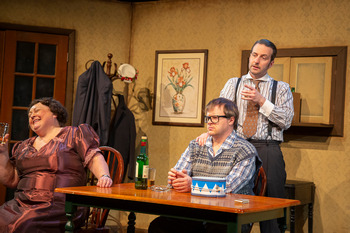 The Nobel laureate's most enduring play debuted about a week before I was born, in 1958. But I had never seen The Birthday Party till now, and never knew it could be a sort of rosetta stone for a genre that engulfed me through my early manhood. This new production at Albion Theatre generates Hitchcockian suspense, merging with (what was soon to become) 1960s counter-culture. Director Suki Peters gives us a mysterious two-hour and fifteen minute staging of The Birthday Party that's often perfectly silly or impressively awful, by turns. The script was written in 1957, before the massive public uprisings against Vietnam, and in Selma, and over Watergate. And yet it seems to predict the same barbaric mindset in our government's reaction to any heated public resistance. I suppose I first learned of the Pinter style through syndicated reruns of British TV shows like "Monty Python's Flying Circus" and "The Prisoner," and (domestically) through the comedy albums of The Firesign Theatre, which seemed at least partly inspired by the playwright. If you grew up on all that, seeing The Birthday Party is a little like getting to meet your birth parents for the first time. The setting is usually described as a modest rooming house on the southwest coast of England, not far from London. At lights up, we begin with a sort of human puppet show featuring the proprietors, affable Petey and daffy Meg (Robert Ashton and Teresa Doggett) starting their day. Stanley Weber (evasive Ted Drury), their long-term boarder, comes downstairs to learn that a pair of men (Chuck Winning and Nick Freed) have shown up to stay at this obscure little house/hotel as well. That's when genuine danger fills the air, twenty minutes in. As Stanley realizes he's finally been hunted down. There's an odd sense in this new production that we are programmed to feel guilt, for no other reason than to control a pacified society, which may be on the brink of a man-made Armageddon and can therefore brook no insurrection. The urgency that comes with all that allows for the pursuit of a runaway criminal at any cost. The new lodgers, unsettling men in black named Goldberg and McCann, come for Stanley with the solemnity of a pair of wary priests. Near the end they pummel him with nonsense, though, like Latin at an exorcism, to break him down. Except it's a kind of bureaucratic/patriotic double-speak, an Orwellian comedy of the condemned. Be all that as it may, delightful and resourceful Summer Baer completes the cast as Lulu, a neighbor girl who seems like a cartoonish "type" from the angry young man school of theater, clad in her "Alice In Wonderland" blue dress and white skirt by costumer Tracey Newcomb. Lulu's presence sparks a basic instinct in Goldberg (Mr. Winning), adding to the suspense, and even to a low-grade kind of horror. And yet Pinter's dialog stands the test of time, in its unyielding style, as she discovers an inner fire to stand up for herself. Goldberg's mysterious government agency remains implacable in the gripping story. And we realize that individual freedoms, like Stanley's or Lulu's, are little more than the disappearing ice in a glass of cola to apparatchiks facing some unknown, existential threat. In the end, the ice is gone, and only the harsh chemicals remain to be gulped down. The Birthday Party runs through March 26, 2023, at the Kranzberg Arts Center, 501 North Grand (a block north of Lindell Blvd.), St. Louis MO. For more information please visit www.albiontheatrestl.org. Cast (in order of appearance): Production Staff: |