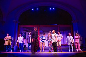 Flash-forward to 2023, and creative lightning strikes again, this time at Stray Dog Theatre, with a highly credible New York subway set by designer Rob Lippert for for a new Godspell production at the Tower Grove Abbey in south St. Louis, along with sirens and explosions, and occasional news reports played on a portable radio on stage, all unfolding underground below the World Trade Center on the cataclysmic morning of 9/11/2001. It's an equally "imposed" theme on the original, but much more fully realized this time. The production is directed by Justin Been, who also serves as associate artistic director. In this case, the very palpable stage surroundings of the New York City tragedy heighten the biblical drama, in a show that might otherwise be subtitled "Everything you ever needed to know about Sunday school (but were afraid to ask)." The 9/11 setting is used to the fullest extent possible, under a proscenium arch, turning bible study into a life-or-death proposition. (In the 1973 film adaptation, Godspell's song "It's All For The Best" is sung and danced atop one of the Twin Towers.) Kevin Corpuz plays Jesus, making him complex and likable and wise. He arrives on stage shortly after the first Twin Towers impact, with a bleeding head wound. He is occasionally set opposite a male version of the original Sonia character, played with fine gay swagger by Stephen Henley. Jesus is perhaps lightheartedly wary, and very mildly reproving with this male version of the original Sonia during the burlesque-y number, "Turn Back, O Man." So it's an unexpectedly welcoming atmosphere for a playful gay character, and Mr. Henley finds at least a dozen ways to enliven him, under the extreme hardship of their shared historical moment. More important, of course, are Mr. Corpuz's splendidly dramatic final moments of anguish in what becomes an underground Gethsemane. As a theatre major, I'm still in awe of a big ornate smoke cloud near the end, which filters overhead in the last climactic moments. I wished I'd had that ghostly grey paisley in several of the shows I've been in, though it's nothing to joke about here. The ensemble of 9/11 subway patrons also includes the highly professional Laura Lee Kyro, singing "Learn Your Lessons Well," and the heartwarming Sara Gene Dowling, who gets the big "Day By Day" solo. And even if silvery soprano Dawn Schmid (who sings "By My Side," written by Peggy Gordon, with lyrics by Jay Hamburger) weren't so flawless in all her vocalizing, she'd still get special mention, if only for her character's crazy-quilt slacks. The big musical numbers are surprisingly fresh and vibrant: the harmonies are good, thanks to music director Leah Schultz, and the dancing is lots of fun thanks to the detail-oriented choreographer Sara Rae Womack. Within the regular pool of actors at Stray Dog Theatre, whenever I want to see the distilled meaning of a scene on stage, I look for actor Kevin O'Brien (excellent singing "We Beseech Thee"), and once again he captures each moment on stage with artistic perfection. There is first rate work too from Rachel Bailey, Grace Langford, and Chris Moore. And Alexander Johnson (as John the Baptist, and as Judas Iscariot) adds pensive, subtle meaning, and a delicate sense of discovery, to a "towering" story. Godspell runs through August 26, 2023, at the Tower Grove Abbey, 2336 Tennessee Avenue, St. Louis MO. For tickets and more information please visit www.straydogtheatre.org. Cast: Band: Production Crew" |