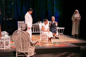 This same ravishing wickedness comes back to life in a new production of 1958's Suddenly, Last Summer, under the direction of Tim Ocel. His fast-paced, elegant production runs through September 17 at the Center of Creative Arts (COCA) as part of the Tennessee Williams Festival of St. Louis. Minutes before curtain, in the modern lobby of COCA's Catherine B. Berges Theatre, a group of friends and I mused that the 1959 film adaptation may have been too gothic. It was definitely a lot slower, with twenty-four minutes of extra padding. But this new staging obliterates the film's loggy Southern pace. Psychological bandaids are ripped off of each of the characters one by one, exposing half-healed wounds along with the shock and shame of exposure itself, until the villain is undone. Set in New Orleans in 1936, the play reminds us that the smug Levittown era of its Broadway premiere was also a time of great, invisible theatrical fractures and purple contusions of character. Lisa Tejero plays the genteel spider woman, Violet Venable. She's so charming and socially ingratiating (at first) that an earnest young psychologist (Bradley Tejeda) couldn't possibly have known to have gotten his own affairs in order before stepping into the carnivorous garden of her late son Sebastian, a globe-trotting aesthete and would-be poet. After Sebastian's tribal, hypnotic death, Mrs. Venable has assembled a coterie of fearful dependents to safeguard his reputation, and her own. On top of that, her late son the poet remains dangerous (for his own controlling nature) even in death. Sebastian appears on stage only in the form of the clothes he wore, which now adorn a far lesser cosmopolite. We first discern him–not just through the stories of his mother, but also through a kind of haunting subtraction–by everything a surviving male cousin (played by Harrison Farmer) is not. The decedent is further revealed by the racy travel tales of a female cousin, Catherine, played with great charm and distinction by Naima Randolph. Dr. Cukrowicz (Mr. Tejeda) arrives on the scene looking for an endowment to fund his work in the new science of prefrontal lobotomy, to pacify mental patients who could not be quelled by electro-shock therapy. His search for funding has drawn him to this Garden District address, but he first must interview a potential new patient, young Catherine, who has humiliated Mrs. Venable with her stories about Sebastian. In a colorful 2021 biography of Williams' early years in St. Louis, "Blue Song," author Henry Schvey makes a startling claim as to why the playwright's own sister might have been subjected to lobotomy of her own: to prevent Rose Williams from taking violent revenge after childhood sexual abuse. Ms. Randolph (as Catherine) is the perfect Williams ingenue, a radiant, freshly damaged presence. She and Violet will be reduced to madness by their exposure to a clever wordsmith. Both are caught in the grip of Williams, as surely as that of the late Sebastian. We learn the poet has tempted each of them to obtain secret male companionship for his own pleasure. And doomed both of them to soft poetic, summer lightning rhapsodies of their own. Sebastian, I mean. Though you say the same thing about Williams, I suppose. Suddenly, Last Summer runs through September 17, 2023, at the Tennessee Williams Festival of St. Louis, Center of Creative Arts, 6880 Washington Avenue, St. Louis MO. Evening shows are at 7:30. For tickets and information, please visit www.twstl.org. Cast: Production Staff: * Denotes Member, Actors' Equity Association |