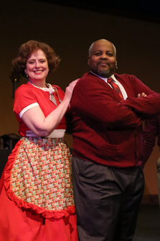 Tony L. Marr Jr. co-directs and choreographs, and despite some acting unevenness (the male performers on stage sometimes lose their showbiz swagger), the popular musical actress Kay Love is matriarch Bess Goodson, along with Marlee Wenski as her on-stage daughter Tammy. Bess is a Donna Reed/Barbara Billingsley type mom in the 1950s TV show family presented on stage in act one. Ms. Love handles the play's satirical tone, and each of her solos, with great finesse. In act two she reveals an unexpected flair for stoner comedy as the wise, pot smoking alien Johnny Appleweed. Act one gives us a fresh absurdist approach to the family-friendly TV sitcoms of the 1950s. Absurdist, partly because it's the very last Christmas of the "Happy Days" decade, and the 1960s are already banging on the door of the show's ranch-style house interior, lovingly designed by Rob Lippert. Act two, borrowing from A Christmas Carol, seems a lot stronger, both musically and theatrically. The finale peals with holiday glory. Ms. Wenski, as Tammy (in a multi-racial family, in extreme denial of its complexions), unleashes bluesy power in "Miles and Miles," a song about her interracial love affair. And later she opens one of the show's many doors of originality with a dream sequence, singing a Hollywood scandal song, "Don't Look At Me! I'm Sandra Dee!." Tawaine Noah, in one of his two roles onstage, does very well with a psychoanalytical song, "You Act Like Dad." Perhaps because it's a world premiere, the men on stage sometimes appear to be mildly unsure of the comedy, and tentative with Mr. Miller's complex be-bop rhythms. But when everyone speaks with conviction, and when the power of the singing matches the subtle '50s jazziness of the music, the show floats giddily along. >"That Stick Up Your Ass" is great fun, late in act two, as the conservative dad (the charming Terrell Thompson) gets swept up in a sotto voce soft-shoe type number with the rest of the cast. And Tony L. Marr Jr. (the assistant director and choreographer) stepped in at the last minute as teenage son Chip and is delightful, facing up to the challenge. An additional four-person chorus is excellent handling the jazzy score, and they appear to be on the right track in developing eccentric background characters to heighten the mood. Lauren Smith Beardon supplies the first-rate costumes. Mallory Golden leads a flawless band, although when New Line brings the show back next December (as I hope they will), maybe they could have an entr'acte as everyone settles back in from intermission, to avoid a long, awkward silence. Or maybe that suspenseful stillness heightens the marijuana-like paranoia of the moment. It's funny that you can take this much-less traveled road to guaranteed Christmas cheer, and get there all the same. The original music is very impressive, blending with sometimes pointed satire for a snarky (and oddly charming) holiday event. Jesus & Johnny Appleweed's Holy Rollin' Family Christmas runs through December 16, 2023, at New Line Theatre, Grandel Theatre, 3610 Grandel Square, St. Louis MO. For tickets and information please visit www.newlinetheatre.org. Cast: Production Staff: |