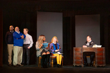 But they had a miraculous rebirth this past fall, and ever since, I've been "clapping for Tinker Bell" whenever the West End Players Guild puts on a new show in this, their 112th season. Because the group's sensibility, in choosing fresh, offbeat plays with a down-to-Earth style is almost always delightful. And because (to me) theatre will always be the magic fairy that saves you, in a world full of Captain Hooks. And so it is now, with An Evening of One Acts, directed by Carrie Phinney and Renee Sevier-Monsey, in the familiar basement of the Union Avenue Christian Church, the group's longtime home. But I have to clap a little harder for about half of these seven short plays, to keep the magic alive. The whole production runs about 105 minutes, including a fifteen minute intermission. The other half of the bill is great, with actors who are anywhere from fine to fabulous. So let's get started, in no particular order: Surprise, by Mark Harvey Levine, features Mike DePope as a psychic who can only see two minutes into the future. It's a genuine comedy, because of course two minutes isn't far enough ahead to do anyone any good. He meets his girlfriend (Amie Bossi) at a diner, where she feels increasingly trapped by the grueling determinism that comes along with his gift. Shawntay "Tay" Vaughn is the bemused waitress, completing a perfect comic equation. A Sunny Morning, by the 19th century Andalusian playwrighting brothers Serafin and Joaquin Alvarez Quintero, features Jane Abling and John Reidy as Spanish senior citizens who take an immediate dislike to one another on a park bench. But fate twists and turns, and a grand legend arises from their chatter, embellished by asides to the audience. Both performers hold their characters up to the light, where a romantic story gleams. Mr. DePope and Ms. Bossi return as a couple in Post-Its, a Nichols and May-type sketch about a date that turns into a lifetime together, played out through those little pastel-colored sticky notes. It has some nice laughs and a fine emotional structure, as written by the actor Paul Dooley and his wife Winnie Holzman. One of the evening's comic highlights, Controlling Interest, is written by Wayne Rawley. And it reminds me of TV's "South Park," with a gaggle of eight-year-old boys played by grown men, who carry on with their eight-year-old lives as if they were running a major corporation (see photo). The group includes the always-enjoyable Michael Monsey, and it's headed by a very "take-charge" Mr. Reidy. The boys' great upheaval comes when they begin to start thinking about girls. Ms. Abling whips out a pair of binoculars in There Goes The Neighborhood, by local playwright Marjorie Williamson, to imagine an epic, sordid life for the woman moving in next door. Kurt Knoedelseder plays Ms. Abling's husband, who turns everything around in the final moments. The Spot was written by Steven Dietz, who has been listed as one of the twenty most produced playwrights in the United States. His forthcoming new book is entitled: "Doom Eager: Notes on Making Plays." The spotlight here is on political focus groups and campaign polling, with a blood and guts performance by Mr. Reidy as a campaign manager overseeing production of a new video advertisement for his candidate. It features six members of the evening's ensemble, including Lesa Bush as a campaign assistant who suddenly becomes the center of attention. The one-act with the most interesting structure is Left to Right is also by Steven Dietz. Mr. Reidy, Mr. Knoedelseder, Ms. Bush and Ms. Bossi play married couples whose romantic lives intertwine like a Christmas wreath, with each private conversation making things more and more complicated. I like it just because it gets so confusing, and the actors wrestle through the story with such tenacity. It sounds very pat to say these are all "relationship plays," whose performance dates lovingly bookend the Valentine's Day rituals of 2024. Because, of course, every play seems like a relationship play. But, taken together, most of the works in this collection of blackouts shake the dust off our intimacies, though in different ways. The larger meaning? If you don't keep up the relationship, lovers just gradually go away. And the same is also true for theatre companies. An Evening of One Acts runs through February 18, 2024, at the Union Avenue Christian Church, 733 Union Blvd., St. Louis MO. For tickets and more information, please call 314-667-5686 or visit www.westendplayers.org. Ensemble: Production Staff: |