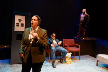 Company founder Philip Boehm has translated from the original German, retaining a tantalizing European flavor in the script by Olivier Garofalo of Luxembourg. His play debuted in October 2019 at Theater der Stadt Aalen (in Baden-Württemberg) in Germany. Mr. Boehm elegantly directs the American debut of this 90-minute show as well. It's a play about two people in a tense hospital waiting room who've never met till now. But they've known of each other for some time. Sarah (Caitlin Mickey) has been engaged to marry a man who's suddenly the victim of a high-speed motorcycle crash, and Pedro (Isaiah DiLorenzo) is the victim's motorcycling buddy. As that fiancé/biker pal struggles for life, the two characters on stage circle one another over the disputed territory of his soul. Much of the spiritual dimension comes from a third person, a paradox-minded narrator played by the warm and wise Eric Conners. He adds quizzical stage directions spoken from the sidelines. But his physical presence regularly balances the visual imagery, highlighting Mr. Boehm's poised staging. And best of all, Mr. Conners lends a skewed new insight when words fail the uneasy pair. The dialog, like a motorbike tour, is full of wide-open straightaways and hairpin turns. In the fast-paced stretches, Don't Wait for the Marlboro Man reads like the conflicted blank verse of a dying man. In its more coiled moments (where Sarah tries to impose order on these child-like men), there's also a sense of whiplash from her suddenly crushed hopes and the blame she puts on Pedro. Our own hopes for grand conflict are traded for a satisfying cosmic metaphor: Pedro keeps an ant colony at home, which he insists will help Sarah understand her own life better. And a subplot about Sarah's work for (what is apparently) a shadowy arms dealer lends intrigue. But more ingeniously, a heart monitor off-stage rhythmically aligns with a broken-down vending machine in this waiting room, telling us everything we need to know about the struggle of the man in question, through sound effects. Michael Musgrave-Perkins and director Boehm designed that unsettling harmony, with additional musical accents to highlight a weird, pensive mood. In spite of my own instincts, I must confess that literary conceits (like ant colonies and broken-down vending machines) actually can make good substitutes for stage combat. In this case, they are "war by other means." Don't Wait for the Marlboro Man, produced by the Upstream Theater company, runs through April 28, 2024, at Kranzberg Arts Center, Black Box Theater, 501 N. Grand Avenue, St. Louis MO. For tickets and information, please visit www.upstreamtheater.org. Cast: Production Staff: Additional Production Staff: * Denotes Member, Actors' Equity Association |
