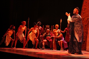The singing is great, and the show's con-men and -women add plenty of delightful twists and turns. It's the all-Black version of the 1953 musical Kismet, a Golden Age show that was co-written by Luther Davis and Charles Lederer using the melodies of Alexander Borodin, with lyrics and additional music by George Forrest and Robert Wright. The musical Kismet was based on the original 1911 play of the same name, a tale of exotic romance by Edward Knoblock. (My Middle Eastern spouse pronounces it "Ghesnmat," which roughly translates as "your portion," or perhaps "the hand you were dealt.") Anyway, both of the subsequent musical versions feature great songs like "Stranger in Paradise" and "Baubles, Bangles and Beads." And the 1978 all-Black version is now getting a melodic new staging (thanks in large part to great singers and music director Colin Healy) at the Edison Theatre at Washington University. The 1953 songs, carried forward in 1978's Timbuktu!, gain dramatic intensity with the addition of African folk music and striking tribal-style percussion live on stage by Caph P. Guei. And from artful, intense dance specials choreographed by Haley Rhiney. The original Timbuktu! ran just six months on Broadway, but earned four Tony Award nominations, including one for Luther Davis (bookwriter) for Most Innovative Revival (of his own 1953 show). That said, 46 years after the first Timbuktu!, the night I went, there were a lot of tiny little dead spots in the production, in between all the bright spotlight moments. And the two young lovers, played by the very likable Evann De-Bose (as Marsinah) and Dereis Lambert (as The Mansa), suffered grievously from dead microphones at the beginnings of each of their songs. But they both sound like beautifully trained singers, and their tenacity proved triumphant: their voices build and twine and come to complex climaxes every time. Overall, the show looks great, with a beautiful storybook set by Dunsi Dai, and costumes to match by Kristie Chiyere Osi. Duane Martin Foster is fine as The Poet, who's also the con-man father of Marsinah. And, like the two ingenues, he sings with remarkable artistry. But the show's comedy is not in his key. More broadly, the supporting cast is terrific, in spite of the fact that there's almost always a tiny breath or pause between all the dozens of entrances in new scenes. These, collectively, are the source of the many little dead spots that bedevil the action. The strings were wobbly in the overture in this weekend performance, but otherwise the band played beautifully. Once things get going in each scene or song, Timbuktu! is great. But, on stage, any time the show has to rely on smooth entrances, there's a tiny little pause. It's very odd, because there are three stage managers credited. And yet we somehow end up with the opposite of director Himes' (or any director's) intended result: a smooth-flowing show. None of these criticisms (of delayed entrances or of phantom limb humor, or those heartbreakingly somnambulant mic cues) apply to the great Drummond Crenshaw as the comical bad guy, the Wazir of Police. His histrionic machinations (especially in Act Two) add a powerful sense of relief to the term "comic relief." Likewise, Amarachi Kalu is terrific as his wife Sahleem-La-Lum, a deliciously stagey presence. By her side, the delightful Kimmie Kidd is a pleasure to watch, and vastly overqualified to play Sahleem's clever lady-in-waiting, Najua. Keith Tyrone Williams is grand and imposing as the pirate, and tireless in a long list of ensemble roles himself. Timbuktu! runs through June 9, 2024, at the Edison Theatre, on the campus of Washington University, 6300 Forsyth Blvd., St. Louis MO. For tickets and information, please visit www.theblackrep.org Cast: Ensemble: Musicians: Production Staff: * Denotes Member, Actors' Equity Association ** Denotes Member, the Society of Stage Directors and Choreographers, Inc. |