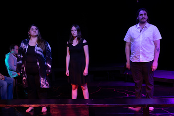 But the story is too similar to the company's 2022 drama, The Length of a Pop Song, even upgraded with the elements of Antigone (written by Sophocles in 441 B.C.). There are two narrators, Brittney Roberson and Charles Melton (he's a late addition to the cast), and both perform with admirable intensity. Still, their opening commentaries (like lawyers speaking forcefully to a jury) go on and on in the first ten minutes. And it seemed to me their most trenchant remarks (throughout) could simply be incorporated into songs within the action. By the final 30 minutes of this one hour and fifty minute one-act play, we come to dread the importuning of the narrators as we struggle to live in the drama. Maybe the pair could be more dynamic, perhaps regressing psychologically throughout the play (like Merlin aging backwards) to become irreverent gods, bizarre giggling babies, who confound the mortals. This is a purely random suggestion. Currently, the narrators serve as an accusing Greek chorus (in a play chock-full of accusations), directly clashing together late in the action. And the young people within the story are likewise bound by ancient fates, tangled up in a modern sextortion scheme. There's quite an interesting little moment near the end, where the story's central character Cascade (played by the very fine Josie Schnelten) seems to realize there are one or more gods she could appeal to, somewhere beyond her fate. But it's a candle in the wind, and quickly snuffed out. Needless to say (for anyone acquainted with the source material) a fiery death is inevitable. Before that, sophomore Cascade runs away from college after describing her retribution upon a gang of rapists, leaving behind her broken-hearted girlfriend Trinity. Kampbell Hemeyer is quite fine in that role. And when Cascade returns three years later to learn of Trinity's death, she sets her heart upon revenge. Luke Goeckner is great as the show's Creon, a character also named Luke. He's a manipulative young man with video of a lot of drugged-up orgies hidden away on his laptop, which lends him his wicked power. It's an unexpected bonus, in terms of casting, that Mr. Goeckner has just the tiniest resemblance to billionaire Elon Musk in his facial profile, in a certain light. (The lighting is also nicely upgraded here, over past Tesseract shows, by designer Matt Stuckel: partly through the use of strands of "airspace" bulbs overhead, and through twin portable light trees that create a 1950s 3-D movie look.) And author Gruenloh gives Mr. Goeckner a couple of beautifully written speeches about Luke's dark take on the world, in remarks the actor dispatches with delicious psychopathy. There is great acting, too, and fine singing from Ella Penico as Luke's tormented girlfriend Olivia. Everyone on stage is coaxed to excellence by the director/playwright/lyricist. David Pisoni is fascinating as Dylan (a prophet-like secondary chorus), the only one who can see the damage Luke is doing to their college town. And Jordan Ray Duncan adds beautiful singing and fine acting as Robbie, Cascade's surviving ex-boyfriend. I can't challenge a single moment on stage for its emotional authenticity. The play is verbally quite adroit and psychologically manifold, using a palette almost exclusively of dark colors. But the pervasive mood is contentious and aggrieved, with a lot of sad song (although one particular song, between Robbie and Trinity, is unexpectedly charming). We are severely warned in the opening remarks that this is will be pure tragedy. But everything in our entire shared universe seems to work on some kind of a sine wave of good and bad, or light and dark, and the rise and fall thereof. Except here. Heated accusations, along with the manipulations of one bad man, and a long list of broken-hearted revelations leap out like the streams from a flame-thrower, non-stop for nearly two hours. Some contrast is needed. Finally, as a matter of directorial style, I was taught (in rehearsals for a play thirty years ago) that if you are verbally fighting within arm's reach of one another on stage for any length of time (as most of the cast is here), physical blows must be exchanged, just as a blast of lightning releases an ionized charge from air and land. Here, an impossible tension is scarcely ever broken or relieved. And as a result, a burned-out realization, or "catharsis" (fundamental to tragedy), is never offered up. Cascade's Fire runs through July 28, 2024, at Tesseract Theatre, Marcelle Theatre, 3310 Samuel Shepard Drive, St. Louis MO. For tickets and information, please visit www.tesseracttheatre.com. Cast: Production Staff: |