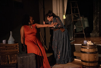 Allison Sexton is very fine as Philoten, a young woman on the run who claims to have killed her mother (hence the play's title). And she flees to "the sacred temple of the sky," where three priestesses try to figure out what really happened. The priestesses also play dual roles, reenacting the events leading up to the murder: the outstanding Rachel Bailey provides most of the comedy as a nursemaid; equally great Zahria Moore plays Philoten's tempestuous mother; and Jade Cash is excellent as Philoten's fiery adopted sister. In her flashback scenes, Ms. Cash (as Philoten's sister Marina) proves the modern adage that "teenaged girls are the new teenaged boys." And Ms. Moore (as Dionyza) and Ms. Bailey (as Lychorida) own the stage with remarkable power, giving the play its scope and spectacle. Two thousand years of classical performance seems to follow them around, but doesn't weigh them down in my estimation. These are the sorts of performances I always wished I could give, myself: where comedy flows in and out of timelessness. Ms. Sexton is innocent and idealistic, and Ms. Cash is rebellious and free-spirited–though she shows a powerful sense of clarity in her own final moments on stage. The fine set is by Erik Kuhn, with evocative lighting by Theresa Comstock. Her light and shadow gives us a hypnotically beautiful little bathing scene behind a scrim. Also unexpectedly interesting are two or three scenes where Ms. Bailey navigates a blend of science and magic with naturalism. But even her Lychorida is overwhelmed as they face a curse re-emerging from our own vanished civilization, ages later. Ms. Sexton's monologs describing epic scenery fill the stage with ease, and e.k. doolin's script stands tall in elegance and insight. Moore and Bailey's scenes together are right on the edge of Broadway quality in their levels of exposed psychological detail and a nearly invisible stagecraft. Who knew Zahria Moore had so many layers? Or that Rachel Bailey was a mystic at heart? It's been a while since we've had depths like these to ponder. Am I Dangerous?, a Contraband Theatre production, runs through October 26, 2024, at The Chapel, 6238 Alexander Drive, St. Louis MO. For tickets and information, please visit www.contrabandtheatre.org, Cast (alphabetically): Production Staff: |