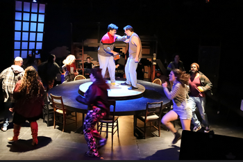 Company founder Scott Miller co-directs with Chris Moore, creating a grand sense of recent history at a time when life could only exist in the moment: filled with prodigal sons and daughters, divorced from their past, and an extremely dark future lurking around every corner. A huge round table dominates the stage, forcing them to come together again and again (Todd Schaefer designed the subtly perfect set), and personal chemistry becomes inevitable in that unbreakable circle. The lovely vocals are arranged by music director (and bandleader) Randon Lane. Jonathan Larson wrote the book, music and lyrics, based on an original concept by playwright Billy Aronson. Larson died the day before the Off-Broadway opening, and never lived to see Rent win the Pulitzer Prize for drama, or four Tony awards, including Best Musical, or to see his show run for twelve years on Broadway after transferring to the Nederlander Theatre from New York Theatre Workshop, where it began its onstage life in 1993. Larson's score builds invisible towers of hope even when there's no such thing in sight. Fresh and original J. David Brooks plays Mark, Rent's would-be film auteur. Brooks suffered an injury as this New Line revival was coming to fruition, but, in spite of his injury, he sings and acts and tirelessly climbs up on that big round table (seemingly) with the greatest of ease. Nathan Mecey plays Mark's roommate Roger with great emotional detail and also serves in the important off-stage capacity of technical director. Corrinna Redford makes a desperate on-stage journey as Mimi, maddening until she fully becomes the emotional crux of it all in the show's final moments. It's a remarkably solid cast, with Aarin Kamphoefner coy and confident as Angel, and Chris Moore deceptively simple as his stoic other half, Tom Collins, a philosophy teacher and computer whiz. Sarah Lueken is funny and stylish as Maureen, with Jazmine Kendela Wade excellent as her long-suffering lover Joanne. Their duet, "Take Me or Leave Me," feels utterly fresh and completely compelling. Chelsie Johnston is great comic relief as Alexi, hoping to seduce Mark into a grown-up job. And Gabriel Scott Lawrence really caught my eye in a series of smaller roles. But you could say the same thing about everyone in this ensemble, they just sweep you away. I hadn't seen Rent all the way through in a while, not since a highly proficient but mechanical touring production blew through town some 15 years ago. But for me, in terms of perfect comprehensibility and a kind of symbolic purity on every level, this time really felt like the first. Rent runs through June 21, 2025, at New Line Theatre, Marcelle Theatre, 3310 Samuel Shepard Drive, St. Louis MO. For tickets and information, please visit www.newlinetheatre.com. Cast: The New Line Band: Production Staff: |