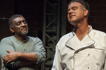 How to Use a Knife takes place in the kitchen of a New York restaurant. The first half hour is a setup as we watch the kitchen undergo some management changes, but the play gains momentum in a scene between dishwasher Steve, who is from Africa, and Chef George, brought in to organize a poorly functioning staff. Important issues tackled by this engrossing play include immigration, the morality of war and substance use/abuse. None of these issues are clearly resolved and I know I will be thinking about this play for a while. The play is performed by a superb ensemble cast. One can actually breathe the relationships between various factions in the kitchen: cooks, the dishwasher, a busboy, the new chef/manager, the owner and oft absent owner. Sam Mossler is Chef George. He is clearly in charge of the kitchen but cares about his people. Cedric Cannon is Steve, whose deeply buried past sets things in motion. Alfredo de Quesada is Carlos and Omar Pelaez is Miguel, two Guatemalan cooks. Michael Fraser is Jack the busboy, and Chris Tipp is owner Michael. Alexis Hyatt completes the cast as Kim, an inspector from immigration looking for Etienne, known to us as Steve. Director Jason Cannon makes the limitations of Bowne's Lab Theatre a plus for this production. With limited scenic design by Bruce Price possible, he keeps the focus on the characters and the plot. He does amazing work just keeping seven characters moving with purpose in a tiny playing space. Costume designer Adrienne Webber offers attire that helps define time and place. Lighting designer Bryce Benson and sound designer Thomas Korp provide professional results. How to Use a Knife is provocative theater at its best, and I highly recommend it. Florida Studio Theatre's How to Use a Knife, through February 9, 2018, at the Gompertz Theatre 1241 N. Palm Avenue, Sarasota FL. For tickets and performance information, please call the box office at 941-366-9000 or visit www.floridastudiotheatre.org. Cast (in order of appearance):