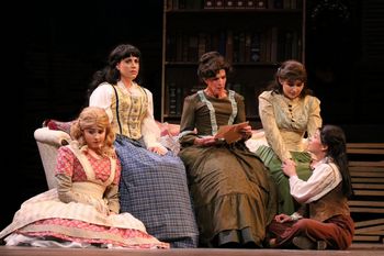 This Little Women began life with a workshop, a full production and another workshop at Duke University, 2000-2004. It was produced on Broadway in 2005 where it expired after a run of a few months. This show is sabotaged by a score which I would describe as uninspired. The songs do not immediately let the audience know the time and place of the setting, and most of them lack dramatic specificity. One of the strongest songs in the score, "Some Things Are Meant to Be," is so generic that it could be dropped into a dozen or more so-so musicals and it would fit. In a duet for the second romantic couple, Meg and Mr. Brook, the dramatic balance shifts so badly that I got confused as to which couple is primary. Both acts open with sequences meant to show the audience how over the top Jo's early writings are. Both are musically uninteresting. One of these would be sufficient to make the dramatic point, but two are overkill and the one that opens the second act is much too long. The book isn't much help, as the characters are so sketchily drawn that the audience doesn't really take them to their hearts. Considering the weakness of the material, the cast give it their all. All four sisters are strongly cast. Eliza Engle plays Jo, the oldest sister, somewhat between a tomboy and an early feminist. Ms. Engle sings and acts very well, but could use a touch more charisma (the part was tailored for a major star, Sutton Foster). Shannon Wright is the next oldest sister, Meg, the least showy part. Ms. Wright does well by it, and her singing is quite lovely, which is a plus in "More Than I Am," a duet with Meg's soon to be husband, Mr. Brooke. Miranda Wolf is warm and kind as Beth and sings with the best voice on stage, pure and lovely. Belle Babcock plays youngest sister Amy. She played a teenager last year in 13 so I am guessing she is in the age range of the character in the first act. She rises to the occasion in the second act as a more worldly young woman after a trip abroad with her aunt, played by Alice Byrne. Ellen Kleinschmidt plays beloved Marmee with warmth and strength. Adam Fuentes cuts a handsome figure as Laurie, nephew of neighbor Mr. Laurence and attracted to Jo early on, though he eventually he marries Amy. Tanner Fults plays Laurie's tutor and eventually Meg's husband, Mr. Brooke. Brian Kleinschmidt is handsome yet awkward as Professor Bhaer, who eventually wins Jo's heart. Randall Hill plays Mr. Laurence, curmudgeon at first, family friend in the end. On opening night the cast may have been tired after tech week. There were some noticeable problems with singing from almost everyone, which I suspect will improve as they catch up on their rest. Aaron Cassette leads the orchestra, and his band plays well for him, except for a couple of sour notes at the very beginning. Scott Keys directs the production well, assisted by choreographer Vanessa Russo. The melodramas near the top of both acts are lively and spill out into the auditorium in a positive way. The rest of the show is equally well staged and performances by his cast are all strong. Georgina Willmott has designed eye-popping costumes, Caleb Carrier a sensational set, which perfectly shows a farmhouse deteriorating from lack of maintenance, and Patrick Bedell lights everything beautifully. The technical elements all contribute to making this production better than it might have been. Young audiences can take this opportunity to meet the March family for the first time, thereby propelling them toward reading Louisa May Alcott's classic novel. Manatee Players presents Little Women, through April 8, 2018, at Manatee Center for the Performing Arts, 502 3rd Ave W., Bradenton FL. For tickets and information, call 941-748-0111 or visit manateeplayers.com. Cast: |