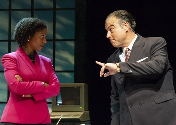 The cast features several company regulars and is strong from top to bottom. Sam Mossler contributes his second excellent performance this season (after his turn as Chef George in How to Use a Knife last winter) as Lawrence (Larry "the Liquidator") Garfinkle. He is charming in an oily kind of way, just the way the character needs to register with the audience. Colin Lane as Andrew Jorgenson, president of New England Wire & Cable, the company in Garfinkle's sights for take over, is caring and compassionate toward all the people who will be affected by the outcome of this battle, but not completely at ease in a business world that has passed him by to an extent. Joe Ditmyer is his right-hand man, Bill Coles, who runs for cover to protect himself when he thinks Garfinkle may be winning. The audience's feeling toward him runs hot and cold, exactly right for the character. Perri Gaffney plays Bea Sullivan, Andrew's administrative assistant and lover in a warm performance. Nehassaiu deGannes plays Kate Sullivan, up and coming corporate lawyer and Bea's daughter. Kate is the head to head adversary doing battle with Garfinkle. She is strong portraying youth, learning as she goes. Director Jason Cannon keeps the story in focus and he gets solid performances from his cast. Isabel and Moriah Curley Clay contribute another excellent scenic design, allowing the action to flow seamlessly between offices of New England Wire & Cable and the New York digs of Garfinkle. Costumes by Susan Angermann are attractive, but seem to set the play a decade later than the mid 1980s the action would suggest. Michael Foster's lighting design and Thom Korp's sound design are both effective. FST gives Other People's Money a darn fine production, but the play just doesn't hold up. The powers that be at Florida Studio Theatre had an interesting idea, to try and offer the audience a look-see at the struggle between basic goodness and corporate greed and the need for profits. This might have been a very interesting topic, but Other People's Money doesn't prove to age well enough to serve as a conduit for this. Other People's Money, through August 19, 2018, at the Gompertz Theater 1241 N. Palm Avenue, Sarasota FL. For tickets and performance information, please call the box office at 941-366-9000 or visit www.floridastudiotheatre.org. Cast: Kate Sullivan: Nehassaiu deGannes*