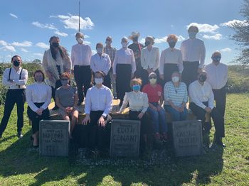 Director Donna Defant (also responsible for the costumes) takes a minimalist view. Everyone is dressed in black slacks or skirts, and white shirts or blouses. Many of the men's shirts are of the collarless variety, making a further statement of time. Each character is allotted one red prop piece, hat, or body decoration to help define the character. The piece is named after a river in Illinois, near the author's hometown of Lewiston, but these denizens could be from anywhere. Masters concentrates on the dark; there are no happily married couples or young people in love among the characters. Instead, we have lots of drunkenness and misaligned couplings. My sociological self pondered if this is the America that parts of our citizenry would like to take us back to. No matter one's interest in the various characters, this is an opportunity for acting. Each performer plays multiple characters, each of which announced as they take center stage. A number of the actors I have seen in previous roles and my recognition carried forward. Others have been in productions I have seen but not in a standout role, and a were are new to me. The entire cast reminded me yet again how deep the local talent pool is. Every one of them is memorable in bringing the characters to life via the free-form poems. Kudos to all. Ken Junkins designed the simple wooden platform and gravestones in front which serve as the setting. Coming up for this roving theater is Sylvia at the Bazaar at Apricot and Lime, as well as a few short programs in various locations. Check their website for further information. The Players Centre for Performing Arts' Spoon River Anthology runs through March 7, 2021, at Jiggs Landing, Bradenton FL. For more information visit www.theplayers.org or call 941-365-2494 Cast: |
