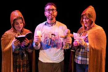 The play starts with Charles (Sam Weeks) and his wife Annie Jo (Maya Weatherall) breaking up. Well, she's breaking up with him, for two reasons he didn't see coming (no, it wasn't another guy). She accuses him of being a bad listener, and even worse, of being Bad in Bed. No, he can't make amends; she's dead set: the marriage of three years is over. Charles, who manages a TV station, ends up staying in the spare room of his college buddy Jack (Nick Kaprelian), the station's sports director. Most of the first act is devoted to the friends' thinking up various plans to get Charles and Annie Jo back together again, to no avail, and gradually focusing in on the underlying causes of Charles's failures–three of them–in marriage. Fortuitously, their old friend Betsy (Sarah Edlund) has just published a book, "Bad in Bed (A Fairy Tale)," and surfaces nearby when she is on tour. Yes, the book has a lot in common with the subject matter of the play. Yes, she's willing to help. Yes, there's still a spark between her and Charles of what passed in the sweet by and by. Instead of Charles just being a self-absorbed jerk, a sufficient reason for serial failure at marriage, it turns out that Betsy gets mad at him for a slight and determines to get revenge–this all back in their student days. Betsy has a crush on him, and Charles lets her down not so gently. She works with her friend Deb (Stacey Garbarski) to curse Charles with being bad in bed, a black mark that has followed him through his three failed marriages. The other reason for the failures, being a bad listener, he provides all on his own, without external assistance. (Despite these bad marriage precursors, Charles comes across as earnest and genial–just clueless.) Deb, whom Charles cruelly nicknames Abracadebra, is still a practicing witch and is willing to come over and perform an exorcism. When Deb arrives, cooler full of witchcraft props in tow, the winds of "over the top" blow in hard through the front door. Garbarski drums up a coven of "witchy" mannerisms in support of her character. As it turns out, the extremes of Deb nicely balance the blander Betsy and Annie Jo and the more solidly grounded Charles and Jack, a tribute to director Ebert's sense of balance and the actors' skills at ensemble playing. Bob Moore's set, which mostly represents Jack's apartment, looks more like an apartment from their student days 15 years prior, when they roomed together in college. Such is the cruelty of community theater, where sumptuous sets don't grow on trees and where most of the audience is close enough to count the nails in the stage carpentry. Above and beyond aesthetics, the set maps out carefully all the acting areas needed for different parts of the story. No matter–the play's the thing, and the story has enough novel twists to focus the audience on the important things. Along the same theme of getting the biggest bang for the buck, Megan Dickel's costumes and Robin Fonfara's props, especially in the exorcism scene, nail the characters and add farcical kindling to the story. In a world in which even Broadway producers are afraid to squander their considerable resources on a play that doesn't have instant and total audience recognition, Madison Theatre Guild and Madison College Theatre, as well as World Premiere Wisconsin, are to be commended for risking it all on original plays. The positive reaction of the more-than-full house spoke well for their efforts. Bad in Bed (A Fairy Tale) runs through March 11, 2023, at the Bartell Theatre, Evjue Stage, 113 E. Mifflin St., Madison WI. For tickets and information, call 608-661-9696 or visit bartelltheatre.org. For more information about World Premiere Wisconsin, visit worldpremierewisconsin.com. For more information about Madison Theatre Guild, visit madisontheatreguild.org. Assistant director: Rachel Seizer |