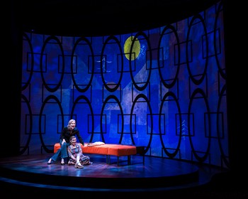Diana teaches art. Her personality is punctilious and disciplined. She likes to cook. She is unmarried. She has enough money, on her own and through her family, not to have to worry too much. Alice, on the other hand, is looser about everything. She and her husband (the economist Doug, who teaches college but is waiting for tenure) are perpetually broke. The play consists mostly of monologs by the characters, with occasional dialog in scenes between them (sometimes with Diana filling in for Doug), but the development of their relationship involves a surprising amount of plot. Auburn shows a remarkable talent for investing this story with suspense, thereby keeping interest high. A major plot point concerns Doug's idea for a babysitting co-op. He prints coupons–which act as a kind of currency–for the participants, who don't have to pay cash, just turn in coupons. The printing press–a rubber stamp–is in his desk, where anyone can get at it. What could go wrong? Another device Auburn exploits is the fine line between fantasy and reality. We don't always know where we are between the two worlds, until the playwright yanks us back. This technique shows how well he maintains control over his material–and over the audience. The cast manage the twists and turns of their story admirably, from 1976 to the current day, without resorting to old-age schtick or other tired devices. An additional burden for them is that the actresses alternate characters, so that Armbruster might be playing Alice on one night but Diana on another. The play and the performances show the winding and unwinding of a deep relationship. Every detail of the story–rubber stamp, joint, wading pool, house painter, etc.–is precisely chosen to create turning points for the plot, which otherwise might just be a recitation of events. And of course the cast's sense of timing and pacing contributes vitally to the overall effect. The Forward Theater Co. production shows complete harmony with the overall direction of the play. A simple set comprises an oval stage, with steps leading up to it to provide acting levels, atop which sits a sectional banquette with orange covers. A backdrop of ovals and squares (perhaps symbolic of Alice's and Diana's personalities?) also serves as home for rear-projected graphics. The lighting changes in subtle up-and-down bumps to underscore the changing moods (Jason Fassl, scenic, lighting, and projection designer). Rather than encumber the production with needless costume changes, costume designer Shelley Cornia put Diana in jeans and a sweater and Alice in a simple but colorful dress. In addition to subtle music throughout the play, sound designer/composer Joe Cerqua provides a '70s pop classic mix for intro and outro music. Summer, 1976, presented by Forward Theater Co., runs through February 16, 2025, at the Playhouse Theater, Overture Center, 201 State St., Madison WI. For tickets and information, please visit or call 608-258-4141. www.forwardtheater.com Props designer, Kaya Sarajian; Technical Director: Adam Hastings; Stage manager, Shawn Galligan;Asst. Stage Manager, Abbi Hess