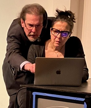 Except that TNW have been around for 40 years and have attracted solid support for their work, typically two annual performances in their yellow box and another in a different venue. It is refreshing to see an original piece with production values pared down to the minimum (though the experience might be enhanced in a black box, which would help the actors stand out from the walls). The set comprises a handful of pieces to suggest desks and a counter, more than adequate for the bare-bones staging. The story is a comedy with sinister reverberations for our time. Natalie (Megan Mori), a freelance (i.e. unemployed) editor, gets what seems like a golden opportunity for a gig with a seemingly respectable publisher. Alas, when the publisher starts playing games like sending her checks to be deposited in her account against purchases for computers, it starts to be clear to everyone except her that this "publisher" intends to scam her. (The common name for such a scam is "hog-butchering," in which the mark is slowly divested of her assets one slice at a time. Ouch!) Without giving away the ending, suffice it to say that Natalie, inspired by Emma Peel in the old TV series "The Avengers," sets about to even the score and then some, taking up the second act. (Her vengeful alter ego's outfit is notable: costumes by Issaka Aguirre.) The chief architect of Natalie's troubles is Noel Cannon (Donavon Armbruster), an angry older man with a knack for spinning fantastical webs to entrap naive souls. His principal tool is Sammy Collins (Patrick Chounet), a talented hacker but not otherwise the brightest bulb on Broadway–or even Off-Off. Natalie's principal advisers hang out at a local coffee shop (proprietor Cass, played by Donna Peckett, and fellow regular patron Lois, played by Danielle Dresden). These friends are instrumental in identifying and unwinding the plot that otherwise would ensnare Natalie. Additional characters are Johnny Angel, an unconventional banker (Francisco Torres, who also directs and does the entertaining sound design), and a solid citizen (also the stage manager), played by Shane Heim. The tone of the acting, excepting Mori and Torres, tends toward the heavy and earnest–the former for the villains and the latter for Natalie's coffee-shop buddies. There were also some line problems on the night reviewed. Some aspects of the story are far-fetched. Does the FBI really leave threatening messages on people's voicemail? And would anyone with any experience in commercial real estate fall for the trick played by Natalie? Still, the script says that her intent is to "flood the zone" with stuff designed to worry the villains, so maybe it's appropriate to throw absurdities at them toward the end, just to throw them off-balance. (Graphics: Michael Duffy.) Scammed! runs through March 23, 2025, at TNW Ensemble, 1957 Winnebago St., Madison WI. For tickets and information, please visit www.tnwensembletheater.org or call 608-770-0826.