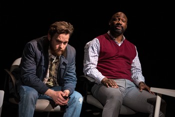 The story concerns Ryan (Josh Krause), a low-wage worker at a yogurt plant, and Keith (Jamal James), a bottom-level mortgage broker, who meet when Ryan comes to apply for a mortgage so he can buy a plot of land on which to buy a house. It turns out they knew each other in high school in the small town of Twin Falls, Idaho (pop. 53,000). While they hardly spoke in high school, Ryan and Keith (the "gay Black teen" in his school) gradually become friends during the course of the play. In addition to being in professional dead ends, they each have a daughter–Crista is Ryan's natural daughter by his estranged wife, and Willa is Keith's foster daughter, soon (he hopes) to be his adopted daughter, if the biological mother doesn't renege on the deal within the first two years (the child is nearly two). If Keith can't find Ryan a loan soon, Ryan's ex-wife will make the case that Ryan, currently living in a crumby one-bedroom apartment, is not a fit parent. And if Willa's biological mother decides that she doesn't want a single gay Black man being Willa's father, she'll yank the kid. Plenty of dramatic tension to keep the story going. As the play goes on, Hunter heaps on the biographical details, which increase the pressure for the characters. How all this comes to a head is fascinating to watch, and the ending is truly a surprise. The staging–unusually, for Forward, in the round–comprises a raised square space floating on a turntable, which rotates 45 degrees or so between scenes, thereby giving everyone in the audience a good view of each character at least some of the time. The choice increases the claustrophobic quality of the staging while reducing the need for in-the-round blocking, which can be a pain in the butt (director, Jen Uphoff Gray). On the square rests a white desk and filing cabinet. Most of the play takes place in Keith's office, though it migrates to his place and to a playground (set design, Noele Stollmack). As they move from banker and client to drinking buddies to friends, the characters' backgrounds pose bumps in the road to intimacy. While Ryan was popular in school, he suffers mental-health issues that make it hard for him to fit in, and he comes from a miserable, drug-infested childhood. Keith comes from a privileged background, with a lawyer father who takes him traveling all over the world. He gets a degree in early music and English, which leads him nowhere. Lighting from directly above increases their sense of alienation (lighting design, Noelle Stollmack). Composer and sound designer Joe Cerqua adds solo string elements to incidental music and muted sound effects. Costumes are jeans and rumpled shirt for Ryan and business casual for Keith (costume design, Jason Orlenko). A Case for the Existence of God, presented by Forward Theater Co., runs through April 13, 2025, at Overture Center, Playhouse Theater, Madison WI. For tickets and information, please call 608-258-4141 or visit forwardtheater.com Additional crew: Props designer, Kaya Sarajian; Stage manager, Shawn Galligan.