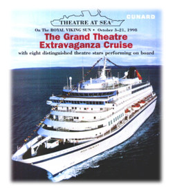 Imagine this, the vacation of a lifetime for theatre lovers! The Theatre Guild has been sponsoring theatre cruises for over 10 years, and this is the 27th time they take to sea with the stars. I've read the brochure a hundred times and I'm so tempted. As you know, for those of you who follow this column, I just took a cruise to Alaska and had a wonderful time. But this cruise looks like it's right up my alley, or any theater lover's. The Cunard Royal Viking Sun is rated with 6 stars by Fieldings cruise guide, naming it one of the finest ships in the world. The ship accomodates 1,200 passengers or more. However, those who book with Theatre At Sea receive deep discounts and special privileges which include special seating arrangements for the shows, dining with the stars, and special events and parties. Just who are the stars you'll be travelling with? So far they have lined up: Kitty Carlisle Hart, Anne Jackson, Patricia Neal, Lynn Redgrave, Gena Rowlands, Jean Stapleton, Leslie Uggams, Eli Wallach, Anne Jackson, Zoe Caldwell and Robert Whitehead. There will also be well known producers and directors onboard.