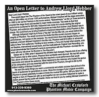 Although Hollywood might try to force a "big star" into the title role, we knew you would defend the integrity of Phantom. You would convince them that this movie's success hinges on performances, not names on the marquee. You would inform them that your show, despite having a then relatively "unknown" Michael Crawford in the title role, Phantom sold $18 million in advanced sales to New York audiences. Pointing to rave reviews, a Tony and myriad other awards, sold-out theatres, international concert tours, and the Original Cast Recording, you would demonstrate that Crawford's name is synonymous with the Phantom--bonded like no actor with any role since Yul Brynner in The King and I. Delays led to 1996 when it appeared the situation had changed. Reports told of you offering the Phantom role to other actors. Phantom fans worldwide were stunned. We had felt certain that, above all others, you knew that this film required a vocal performance that would mesmerize and seduce the audience. What happened to the visionary who trusted the genius of his composition and was rewarded with the soul of the Phantom, brought to life by the brilliant casting of Michael Crawford? We want the same things you want: a commercial and artistic success that will live in the hearts of audiences for generations to come. Show the courage of your original conviction. Phantom is poised potentially to make or break the musical film genre. Will you take it to new heights or bury it? Please join with us and together we can convince Hollywood to make a motion picture that the world will cherish. Honor our trust in you by casting Michael Crawford in the The Phantom of the Opera movie.