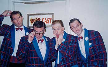 While there are many dark theaters on the Las Vegas strip, and just the word theater has a certain stigma around town, there is one musical comedy which has been pleasing crowds for almost five years now. Voted "Best Revue of the Year" twice, Forever Plaid has been SRO since its opening at the Flamingo Hilton, so we thought we'd pay another visit to see how the show is holding up. The basic premise of the show centers around a paper-thin book, but a gem of a book it is. The Plaids are a four-part harmony singing quartet who meet disaster in 1964. On their way to a singing gig at an airport lounge they are rammed by a schoolbus filled with Catholic teens on their way to a Beatles concert. The girls survive but the Plaids are killed instantly. But, what if they are trapped in the cosmos and come back to do that concert they had planned for the airport lounge? The stage is set, and we, the audience get to see and hear that concert. Four-part harmony groups were very popular in the 1950's and '60's with such groups like The Lettermen, The Four Aces, and others churning out hits like "Moments to Remember," "No, Not Much," "Catch A Falling Star" and many others. Rock 'n Roll pretty much killed the genre, but even today, The Letterman are still touring. Why? Well, it's good music which requires good singers and the Forever Plaid cast consists of four exceptionally talented guys and 2 very good musicians. (David Kancsar, piano, and Ken Seiffert, bass). Not only can these guys sing, but they're comic clowns as well. While they're staging and site gags are always off the mark by a beat, coming off as amateur wannabees, make no mistake about their singing, which is right on the mark and very professional. It all makes for a delightful evening in the theatre. So delightful, in fact, the couple sitting behind me were paying their 5th visit to the show.