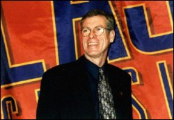 Greeted with critical acclaim, TLS enjoyed a healthy Off-Broadway run but had to close due to a theatre shortage at the time. It next appeared at Laguna Beach Playhouse and then moved to the Tiffany Theatre in Los Angeles where it received rave notices and was nominated for some Ovation Awards. Soon, it will be playing in other major cities across the nation. Because of the musical's success, Steve Schalchlin has found a new career. He's constantly on tour doing his own one-man show, Living in the Bonus Round, at various theatres, churches, colleges and community centers throughout the country. In this show, he talks about religion, about AIDS, and how he wrote The Last Session with Brochu. And, of course, he plays piano and sings his songs. He begins his show with some funny anecdotes. When he hit the opening notes of "Save Me A Seat" I was transported back to TLS. The song is about a memorial service, and to say the least, it's haunting. Off-Broadway, Bob Stillman sang the song in the role of Gideon. Here, Steve is singing his own life and it takes on a whole new dimension. "Somebody's Friend" and "The Group" are next. During the songs you hear people getting out a kleenex. It's totally heartbreaking to think that the performer had gone through all the horrors of living and almost dying of AIDS. Schalchlin knows how far to go and lightens up the crowd with another amusing anecdote. Not one to hog the spotlight Steve introduces a friend, C.J. Liotta, while not a regular castmember, he does a rousing "At Least I Know What's Killing Me." What's interesting is that after about a half-hour there's a subtle bonding of the audience. Sort of like, we're all in this together folks. Another friend takes the stage and sings a song from a show Steve is currently working on. "The Sad Lady" is sung by Jonathan Sturch with such a passion that the audience is cheering. Schalchlin, jokingly, gets rid of him quick. "Going It Alone" is a song that kills me, and I was hoping Steve would not perform it. Of course, he does, and I don't have any kleenex. Yet, I found a new kind of beauty to the song, and I was glad that he performed it. The pace of the second part is brisk and filled with lighter material. "Friendly Fire" had the audience singing and tapping their feet, and the anthem "When You Care" became a hymn-like sing-a-long. Steve receives the standing "O" with a big smile. He's reached his audience and has gotten his message across. The show is entertaining too. As in cabaret, there is no fourth wall, and the audience becomes a part of the drama. You can check out www.bonusround.com for Steve's upcoming appearances, or you can write to him if your college or organization is interested in having Living in the Bonus Round come to your area. Personally, I think he should take the show to New York in either a cabaret club or Off-Broadway. It's theatre in the purest sense of the word. I met up with Steve after the show and we chatted. He's got more energy than me and he's just so enthusiastic about what he's doing. I say goodbye and he yells out, "Love ya, Veej." And I smile because it's hard not to love a guy like Steve Schalchlin. |