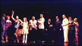 Michael John LaChiusa, who was snatched on stage wearing an all-white tennis ensemble (showcasing his muscular legs), bowed boyishly to a thunderclap response. Also brought on stage was director George C. Wolfe who smilingly and not-too-cryptically railed into the show's detractors - mainly New York Times' theatre critic Ben Brantley, who many believe, along with the dearth of Tony awards, helped to nail the show's coffin shut. "A friend of mine has a saying: If you are being run out of town by everyone, you should get in front and pretend that it's a parade." He went further, lifting his voice over the cheering and laughter, and quoted Einstein, "Great spirits have always encountered violent opposition from mediocre minds." Then, to a deafening response, with the most pointed of his comments he spoke about how art often is ahead of its time and that in the end "Art and theatre are bigger than the (T)imes," punctuating it with "Pun intended." Some of those standing in the audience for the final matinee were two of LaChiusa's former leading ladies; Audra McDonald (Marie Christine) and Donna Murphy (Hello Again) as well as Andy Dick, Ben Stiller, Brooke Shields, Ron Rifkin, Ossie Davis and Ruby Dee.