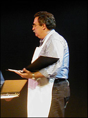 There have been several shows that Jim would have loved to have done in full production, but expense is always a concern. Thirteen actors on Off Broadway contracts can add up to a significant amount, which is one reason few theatre companies are willing to take risks on these projects. Sometimes a Mufti show receives such positive acclaim that it moves to the main stage, which is what happened with A Doll's Life and Mata Hari. The recent productions of The Good Companions and Cyrano are now being considered for full productions at the York. Mufti runs two sets of three staged readings every season, one set in the fall and one in the winter. Each show has its own director and musical director. Rehearsals begin Monday morning, continue through the week, and run for five performances beginning Friday night, with two shows on Saturday and two on Sunday. Actors have the chance to pick up a script and a tape a few days in advance, but for the most part, they are seeing the material and hearing the music for the first time on Monday morning. Each director approaches this concentrated rehearsal period in his or her own way, and in some cases the Friday night performance is the first time they have a full run-through. Performances are done with scripts in hand, in street clothes except for occasional costume pieces that suggest the character, and only the most necessary of props. Jim and the actors claim that each performance improves exponentially as they receive feedback from the audience, and the nuances in the material begin to make themselves known. There really isn't time in five days to delve into the book as much as they would like but Jim calls it a "terrifying but exciting" experience for the actors. Actor Peter Flynn, who played De Guiche in last weekend's production of Cyrano, explains that he approaches a Mufti show somewhat differently than a reading for potential backers. With a Mufti show, the piece is finished and the book is set, as opposed to a work in progress. He knows there's going to be a public performance on Friday night. For those reasons, he spends as much time as he can learning the material so he can be off book as much as possible. According to Peter, "It takes a very responsible and creative director. Michael [Montel] is very efficient with his time and he's very clear about what he wants every step of the way." For Cyrano, Montel spent all of Monday, Tuesday and Wednesday having the cast learn the music. On Wednesday they started a little bit of blocking, and then Thursday was devoted entirely to the blocking. On Friday morning they did it straight through without interruption for the first time.