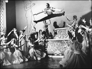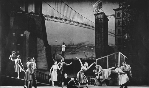 In another interesting section (in Act Two), Grant focuses on Lehman Engel's career and teachings. Though he is respectful of Engel - in fact, almost adulatory - Grant has some criticisms of Engel's teachings, which he says "devolved into codifying and recipe-izing the construction of common-practice period musicals of the 1940s and 1950s: write a 'charm song' here; put an 'I want' song there. Inspiration cannot be manufactured." This is very insightful, even if Grant's discussion of Engel's belief that musical theater improved when adaptations became prevalent becomes a little silly when Grant suggests that this "licensed vulgar and unenlightened producers to option properties and use poor artistic judgment in turning them into musicals written by indifferent talents for the sake of commodifying a sellable show." Can this be regarded as Engel's fault? Further on in Act Two, Grant focuses on Sondheim, admiring him for many things (including that "his musicals are the only ones of recent decades to feature consistently strong books," a statement with which I agree), but criticizing his scores from Pacific Overtures on for a reliance on "extended musical vamps and ostinatos not just as incidental accompaniments ... but as the essential tissue of his musical material." Grant deserves credit for bringing this up. I haven't seen this written about before, and whether this compositional style is detrimental to Sondheim's shows is worthy of discussion. I part with Grant when he writes that as a result of this style, "the ear begins to hear an undifferentiated singsong instead of melodies," but unlike some critics of Sondheim's music, Grant at least seems to be listening to the music and analyzing it seriously. Grant has more fascinating things to say in Act Three, especially on the foxtrot and the rock groove. Though his basic observation regarding the foxtrot's tremendous presence in Broadway songwriting during the golden age is not original, his explication of its usefulness in dramatic songwriting contains much that does seem original and striking. He makes a good case for his assertion that the foxtrot "is singularly adaptable to spoken interior monologue." When Grant is at its best, he is able to clarify things in a very specific way on subjects that are often written about in generalities. For example, when defining the "rock groove" and elucidating its inadequacies as a vehicle for dramatic expression, he writes, "When four equally accented quarter-note beats or eight eighth-note beats accompany a lyric, the emotion of the lyric is attenuated by the beat's very sameness." Further, he suggests that the rock groove "elicits a call-and-response emotional response from the theatergoer similar to the call-and-response of African-American gospel music and spirituals. But call-and-response, although visceral and valid, is a communal gesture of religious revivalism, not a mode of theater." He aptly quotes Elizabeth Swados: "You should not want to get up and dance with a character who is not even supposed to know you're there." Another place where I found Grant insightful was his discussion of Hello, Dolly! This is likely to be one of the controversial parts of the book because Grant regards the show as the beginning of the end of the golden age, writing that the plot and characters are not only "subordinate to gestures of staging, they are enveloped and overwhelmed by them." Grant's critique is thought-provoking, even if it could have been a bit more specific at times. The above gives you some examples of what is good about this book. There is a lot more that is of similarly high quality. But there are problems as well. This photograph of Beggar's Holiday shows a simple painted backdrop still typical of Broadway musical design in the 1940s and early 1950s. Theatre Collection, Museum of the City of New York First, as Grant's point of view on Hello, Dolly! probably suggests, he writes strongly negative things about some beloved shows, writers (though he doesn't blame the writers for what he thinks is wrong with Dolly!) and director-choreographers. Some people may be bothered by this. For me, the problem is that some of his criticisms don't add up. For instance, he writes that "In almost every Kander and Ebb show virtually every song is some variant of camped-up neo-Jolson razzmatazz," which doesn't make me reassess Kander and Ebb as much it makes me question how well Grant knows their shows. Second, if Grant likes any shows by younger writers, he doesn't identify them. What's troublesome is not so much that he has almost nothing positive to say about the younger writers, but that in almost everything he writes about them, he generalizes about them as a group. I wish that he had written about at least one or two of them a bit more specifically. Third, apart from some of his questionable criticisms, some of his larger points don't quite add up. For example, he writes that "Sound design and the microphone may have liberated the physical staging, but they have also erected an invisible psychological barrier between the audience and the stage that is the opposite of theater." On the next page he repeats a complaint that he voiced earlier in the book: that "rock-based musical theater has a permeable fourth wall." But if there is a psychological barrier between the audience and the stage in heavily amplified shows, can the fourth wall be permeable in those same shows? Grant may well be able to defend this seeming inconsistency, but he doesn't seem to realize it's there and consequently doesn't address it. And this, as well as a few other inconsistencies, should be addressed. Fourth, as is so often the case with books on musical theater, there are many factual errors (along with statements that are so vaguely phrased that it's hard to be certain whether they constitute factual errors), as well as silly overstatements, occasional misuse of terminology and some writing that is stylistically sloppy. In some 