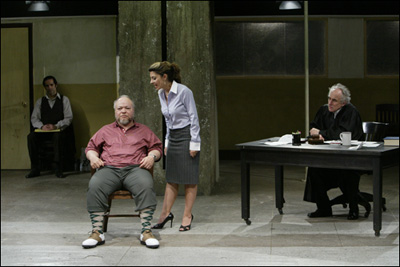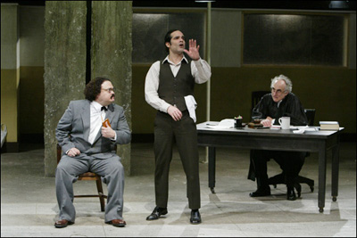 and Stephen McKinley HendersonBy Beth Herstein The LAByrinth Theater Company's The Last Days of Judas Iscariot is currently running at the Public Theater, where the LAByrinth is "in residence." In the play, written by longtime LAByrinth member Stephen Adly Guirgis [Jesus Hopped the A Train, Our Lady of 121st Street] and directed by the Company's Co-Artistic Director [and frequent Guirgis collaborator] Philip Seymour Hoffman, Fabiana Aziza Cunningham [Callie Thorne], an agnostic lawyer residing in Purgatory, files an appeal in the case of God and the Kingdom of Heaven vs. Judas Iscariot. Cunningham's goal is nothing less than to obtain the release from Hell of Judas Iscariot [Sam Rockwell], the infamous apostle who betrayed Jesus for 30 pieces of silver. In Guirgis's play, Judas resides in Hell in a perpetually catatonic state, and therefore he has not petitioned the court on his own behalf. As Cunningham sees it, this makes Judas the most deserving of her help, and the most in need of forgiveness. In the trial that follows, Cunningham is pitted against Yusef El-Fayoumy [Yul Vázquez]. At various points, they call as expert witnesses such figures as Pontius Pilate [Stephen McKinley Henderson] and Satan [Eric Bogosian]; and, as a character witness, "Henrietta" Iscariot [Debra Rush], Judas's mother. The trial culminates with a monologue by Butch Honeywell, one of the jurors, and a moving interaction between Judas and Jesus, both of which put the rest of the play into context. Long, intricate, and full of virtuosic monologues, the play - though uneven - is notable not only for its undeniable intellectualism and the strong performances of all of the actors, but for the humanity and reverence at its core, and the passion and daring with which it examines concepts such as love, judgment and our place in the cosmos. Adrian Martinez, Yul Vázquez and Jeffrey DeMunn in The Last Days of Judas Iscariot I recently interviewed two of Last Days's accomplished performers - original Lab member Yul Vázquez, who plays Yusef El-Fayoumy; and, veteran actor Stephen McKinley Henderson, who has a scene stealing moment as Pontius Pilate - at the Public. The two actors raved about the show, each other and the intoxicating experience of working with the LAByrinth Theater Company. As Vázquez put it, "I wish upon every actor that they would get to work in this company at least once." Beth Herstein [to Yul Vázquez]: You were in the workshop of Last Days. Can you talk a little about how the show has evolved? Yul Vázquez: I can give you my time line. I got a phone call from Stephen [Adly Guirgis], saying he had this idea for a show. He called me and he called Sam [Rockwell]. He asked us to come out to the summer intensive, [a one-to-two week program of LAByrinth] which we do every year. This was two years ago. When we got there, [Guirgis] didn't have any pages. [To Henderson]: You're laughing. Now, you know him. You're like, of course. Stephen McKinley Henderson: Oh, yeah. YV: When Sam and I first got off the train, we went over to see [Guirgis]. He saw us coming and he said, "Don't ask me anything. I don't have any pages." And, I said, "Dude, we're just saying hello. We just got here." The rehearsal was the next morning at around 10am. That night, he wrote 28 pages. He didn't sleep. He does that often. BH: He crammed, and cranked it out? YV: Yes. He can sit at the computer for 30 hours. It's pretty crazy. And, then he comes in the next morning, and he looks like a ghost. But, he had 28 pages. And, that's what we read. And, then a lot of time passed, and he wrote more pages; and, we gave another reading. Then we did the Barn Series [LAByrinth's annual - and free - series of staged readings of works-in-progress]. At that point he had 58 or 60 pages. From there we did a week-long workshop with Phil [Philip Seymour Hoffman] and him and a bunch of actors. From there we got to this, what you see today. Some people have switched parts. I've always only done El-Fayoumy. BH [to SMH]: Was your experience similar? SMH: I had just come out of an experience that was very different for me. I was in a musical [the recent Broadway production of Dracula.] I had never been in a musical before. I was really hoping, the next thing I do, I want to be as far away from this as possible. Well - I got it! [Laughter.] Because in that experience, everything was so set. I had come in late and replaced someone, and everything that I had to do was prescribed. Then, I got to this situation, where anything goes. It's such a creative process. Even the audition was really free. And, it started going from there. I don't remember seeing the same script three days running in the first few weeks. It was wonderful how it was growing. Then, it had to sort of contract, and so that happened. It was always getting better. The roles that Yul and Jeffrey [De Munn, who plays the Judge, and also performs in a few other parts] and Callie [Thorne] were doing were really changing radically. They had to learn an awful lot. So, I was really glad - first of all, to get to be a part of the LAByrinth but also glad that I started out with baby steps. Because they were going through a lot. Clearly though, they were at home with it. They knew what to expect. Then, there was Philip. He and Stephen have a simpatico together. They speak in a shorthand that is really something to watch. To see the company members who are aware of this relationship, and to see them delight in the new heights that the two of them reach - for me, it really is what I consider to be where the theater has arrived. This is where it lives. It arrives on the shoulders of all the giants - all the classic and non-classic, the absurdist - every style that you can think of. Everybody went in there with all the tools and they went to work. It's just incredible to watch. YV: Stephen [McKinley Henderson] made a great comment. He said, "You guys are building plays, and people aren't doing that." We are build