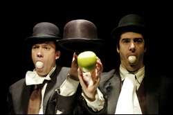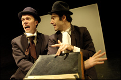 Everyone else came in later on in the process: James Sugg, who adapted the sound design Lyford developed early on; Randy Glickman, who handles the stage lighting; Garth Patil, film producer; and Tara Webb, who designed the costumes. In addition, David Shiner, credited as the show's "vaudeville mentor," consulted with them in connection with a grant awarded to Sobelle. According to Sobelle, Shiner instilled in them "a certain value for the clown work. More than anything else, he raised the bar of performance." Although Shiner didn't create any of the material, Sobelle adds, he helped the actors find the truth in their characters, and in that sense helped them get to "the soul and core of the project." The final and equally critical performer in bowlers is the audience. During the show, the actors break through the illusion of the fourth wall. They address and respond to the audience, and they even pull one of them onto the stage early on in the piece. Although the overall structure of the show is set beforehand, the audience involvement adds nuance and a bit of unpredictability. In addition, when the audience's energy level is high, it adds a measure of energy to the show itself. As for the ending of bowlers, the actors have kept it deliberately ambiguous. Lyford initially wanted it to be unequivocally dark, and some of the audience members see it that way. Others latch onto the continued comradeship of the characters and view the work as more optimistic. "I have a hunch that those people who view the piece as optimistic do so because there's such great cooperation between us as actors," says Sobelle. "By virtue of that, it's an enjoyable experience," despite the darker underpinnings. The show is not only enjoyable but a huge success. It won acclaim in Philadelphia, where 1812 productions gave them their first produced run and where, according to the pair, they were able to refine the piece enormously before bringing it to New York. In New York, bowlers regularly fills up the house at HERE. The show just received a Drama Desk nomination in the Unique Theatrical Experience category. It has also received critical accolades. The New York Times recently referred to it as "easily the most original and funny show this year." And, in the headline for its review of the show in February, The New York Sun described it as "the city's funniest show." The reviews regularly mention the many references: Beckett, Laurel and Hardy, Chaplin, Magritte and others. "We kind of started it," Lyford admits. They described the play in similar terms in their press releases to give people an idea of what to expect. Accordingly, the comments do not bother Lyford and Sobelle at all. On the contrary, they wear their influences proudly, and as conspicuously as they wear their bowler hats. As much as anything else, all wear bowlers is an homage and a nod to their philosophic and comedic forebears. At the end of the month bowlers completes its New York run and will not be extended because both the space and the actors have other commitments. bowlers itself is not over, however. In August, the show will be presented at the Edinburgh Fringe Festival; in September, it will be performed at Princeton as part of a symposium on the use of magic in theater; and, also in September, Sobelle and Lyford will travel to Dublin to participate in the Dublin Fringe Festival. They both remain involved with other theater companies, such as The Civilians and Pig Iron, as well. At the same time, they've enjoyed their extremely fruitful collaboration and their friendship. They are co-artistic directors of rainpan 43, and they're currently developing ideas for future collaborations. In the meantime, they are relishing the opportunities that the show's success has wrought, and enjoying the audiences that enjoy them nightly. all wear bowlers