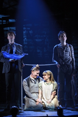 AB: When I first auditioned for the show and got the part, I didn't realize that we'd all be on stage practically the whole time and would be playing different parts. I thought maybe I'd be in full drag. So when I got up there and I was talking to Roger, I asked him, How do we go about having me play this English nanny? How are we going to achieve that? This is actually the first time they've had a man playing this part. But they wanted Molly, the girl, to be the only female in the show. So they were going in the direction of the old English music hall productions, where men would play the parts of the women. In rehearsals we had to figure out how, physically, we were going to achieve this. At one point we thought I might have a whole wig that I would take on and take off. Then, we were talking to the costume designer and came up with the idea of this hair band with a bun on top of itin keeping with the style, using rope instead of real hair for the bun. I can just rip it off or on in a second, it just appears and disappears. So, I never am fully in drag, I have to achieve the character with this hair band and an apronwhich at first looks like a cook's apron, but for Mrs. Bumbrake becomes a dress. The rest is through body and voice. I'm so grateful, really, because this is a much more theatrical and interesting choice to me for this character than drag would have been. BH:  In addition to Mrs. Bumbrake, you play other characters. In several of your shows recently you've played more than one role. What are the challenges and rewards of this type of casting? AB: I've been really lucky because, especially in the last few years, I've been able to do a lot of that. I can barely remember the last show where I played only one character. It certainly comes in handy because today, with the economics of theater, you can't have huge casts. Yet writers still want to tell great stories. So, over the last 10 years or so there's been this idea of having actors who are able to play several roles in one play. I know all the tricks nowand there are a lot of them. Making bold choices for your character, being able to switch [from one character to the next] when there's no time to add anything or do a complete costume change. I actually love it, there's no sense of monotony. It makes the evening go by fast. BH: Bloody Bloody Andrew Jackson, which co-director Alex Timbers directed, shares some of the silly-smart sensibility, some of the more scatological humor. The night I saw Peter, the audience really embraced all of that. Although it starts out like that, it becomes more and more of a personal journey story as well, so by the end it's eloquent and moving. AB: That's true, and it's become even more so as we moved from New York Theatre Workshop to Broadway. That was definitely a very conscious part of the evolution as the show went to the next stageto temper the comedy. We actually cut a few jokes, even ones that worked, because the directors or the playwright thought that they were getting in the way of the heart of the story. And the profound movement of Peter's search for home, and his connecting to the girl, and even the sense of love of story and theatersometimes the comedy can be distancing from that. It was a real trick in finding where we could allow the comedy to be, and allow it to go full force, and then where to pull back and let the audience see something deeper. So yeah, we have a number of good old fart jokes that play great, and hopefully what gives Peter its reason for being, more than just its fun and laughs is kind of this deeper yearningone, to celebrate the theater and the imagination; and the other, the characters' yearnings for home and family. It worksyou see people laughing so hard, but as you look in the audience in the final minutes you can see some tears. That's pretty great. BH: At intermission, my friend and I wondered whether there were enough children's jokes and story lines mixed in with the elements for grownups, that children could enjoy the show. We thought so but weren't sure. As it turned out, we ran into a couple with three children, and they loved the show, already had their favorite characters and scenes. AB: It is a wonderful kids' storyteens grew up on these books, and we wanted to honor that. You have pirates, a shipwreck, and Peter Pan. A flying cat. But underneath it are adult jokes and an adult story line, and a very complex plot. If we veered too far [away from that], one of the directors would say, "No, now we're going too far into the children's theater realm." Rick [Elice, the playwright] did a wonderful job of balancing all those elements. We are confidently riding the line between making it a real play, which I think it is, but something that could be accessible to the kids. Then, Alex has [injected] really remarkable stagecraft stuff that is more downtown than Broadway. So, it's a whole cornucopia of everything. I think they've made it truly a show for the whole family.