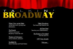 I, of course, knew nothing about designing a website. But, through the Tony Forum, I met Mark Bakalor, a young college student who was a true whiz at web and graphic design. We went into contract and he took my ideas for the site and magically made those ideas into a visual paradise for me. One thing I did not want was a message board, but Mark and his brother had other ideas and created a message board as part of Talkin' Broadway. I warned about the problems of the Tony Forum, but Mark assured me that he would monitor Talkin' Broadway's forum 24/7 ... and so I gave the go-ahead. I gave it the name All That Chat because of my love of the musical Chicago. All That Chat debuted five days later on February 3, 1997. So, really, Mark Bakalor and I created Talkin' BroadwayI could not have done it without him.