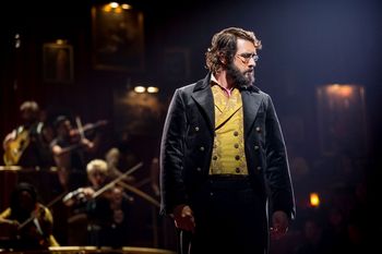 BH: How is it working with Josh Groban (Pierre) and Denée Benton (Natasha), both of whom are new to the show? What adjustments have you made? PY: It's been great folding them into the preexisting design. There were just certain things about the fit we changed. I got a different shape of glasses for Josh Groban. He wears glasses in his everyday life. The glasses are still period, but they're larger and more open than [those worn by] our previous Pierres. There's a sort of bridge between what Josh's face is and his sweet, dorky intellectualness. For the most part, with the addition of a little padding, he really walked into the role in a surprising way. We [worked] with his hair and makeup to make him look as sickly as possible. I was really inspired by [Denée's] bubbly youthfulness. The character of Natasha has always been very young, but when Philippa Soo originated this role, there was also a sophisticated beauty within her demeanor. Watching her sing, even when I met her initially, I knew we'd be rethinking the dress she puts on for the ball at the end of act one. On paper it doesn't seem like that much different. Phillipa wore a white chiffon with a French-gold lace trim and little bits of green to represent Hélène's influence on her. But when I was choosing fabric for Denée, I found this amazing fabric that had these bright silver polka dots on it. I would never have thought of silver in the context of this show before, because there's so much gold. I was inspired by her. I also decided there needs to be more movement to the dress, so there are dangly, globe-shaped beads on the dress. She gets this fancy dress and puts it on and gets swept awaybut it wants to feel light, like she drank too much champagne.