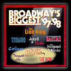 The last Broadway jazz CD is Broadway's Biggest '97 -'98. First off, I have a problem with the title of this disc. I believe it implies that you will be hearing songs from the biggest hit shows which opened on Broadway last season. This is not so. First, there are two songs included from the '96/'97 season, "We'll Meet Tomorrow" from Titanic and "This is the Moment" from Jekyll & Hyde. Secondly, there are no less than four tunes from flop musicals. Third, there is one song that wasn't even performed on Broadway; "Home Again" from The Scarlet Pimpernel was only heard on the concept CD. How can this CD be Broadway's Biggest from '97 - '98? I am not sure. At any rate, it is performed by Grant Geissman on electric and classical guitars.